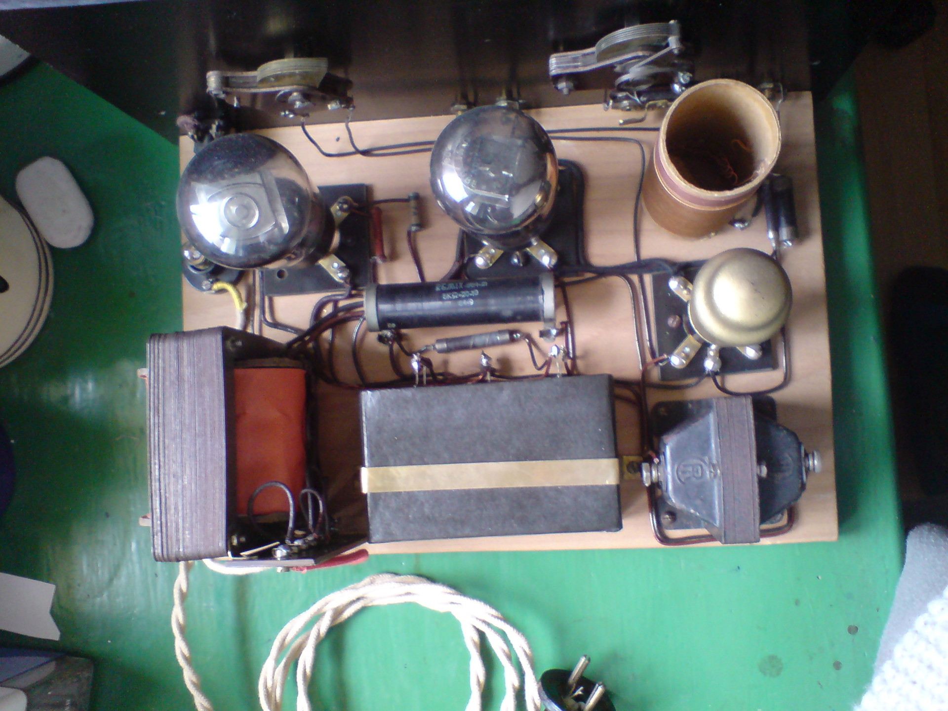 Addig is összegyűjtöttem pár korabeli építési leírást, hátha valamelyik megtetszik. A képet megnézve eredetileg árnyékolt rácsú cső lehetett az első fokozatban. Az árnyékoló fémlapon egy lyuk is van a számára vágva, hogy a ballon tetején lévő anódkivezetés a lehető legrövidebb kábellel menjen az audion fokozathoz. Ehhez hasonlót is fogok küldeni. Első adag: