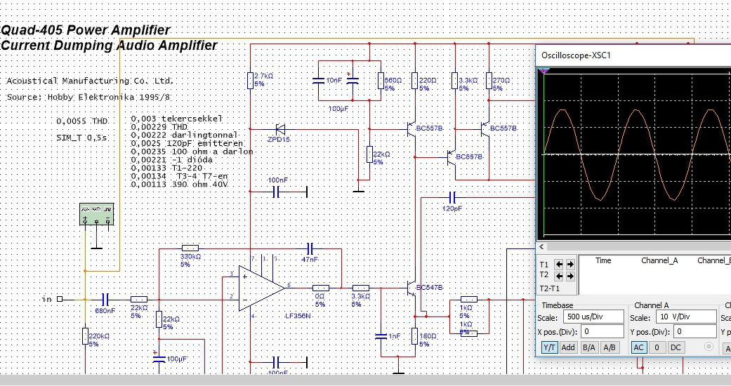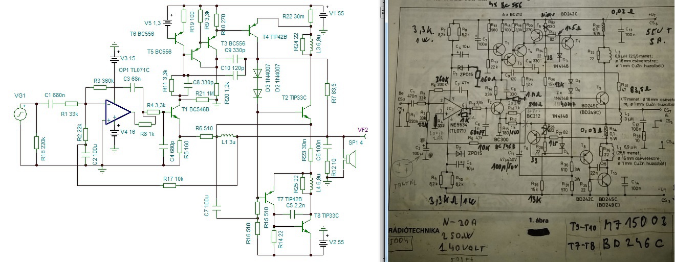 Nem kell berajzolni, valaki megtette már évekkel ezelőtt, én is azt mentettem le, és szórakoztam vele napokat. A végét átalakítottam a hagyományosról komplementer darlingtonra, áttettem a híd kondiját, máshova, mértem átvitelt, teljesítményt, torzítást. A torzítási adatok mellé odaírtam hogy akkor éppen mit változtattam rajta.