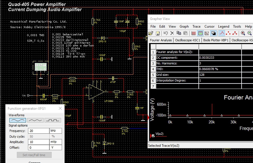 A stabil feszültségeket fix forrásból viszem be, ez gyorsítja a szimuláció lefutását és tapasztalatom szerint nincs hatással az eredményre. A tranzisztorok közül aminek nincs meg a makrója, azt kénytelen voltam helyettesíteni olyan példánnyal amitől hasonló eredmény várható. Más kapcsolásoknál sem volt ezzel gondom. Az áramkorlát 20 A csúcsáramot enged meg, nem is tettem föl az ábrára. A 4 Ohm 200 W-ot és a 8 Ohm 130 W-ot kényelmesen teljesíti. A Quad405 igazi problémáján, a hangfrekvenciás sáv felső tartományában a kis amplitúdójú jelek torzulásán sajnos ez a változat sem segít. A szimulátor 10 mV 20 kHz bemenő jelnél 12 % torzítást mutat ki.