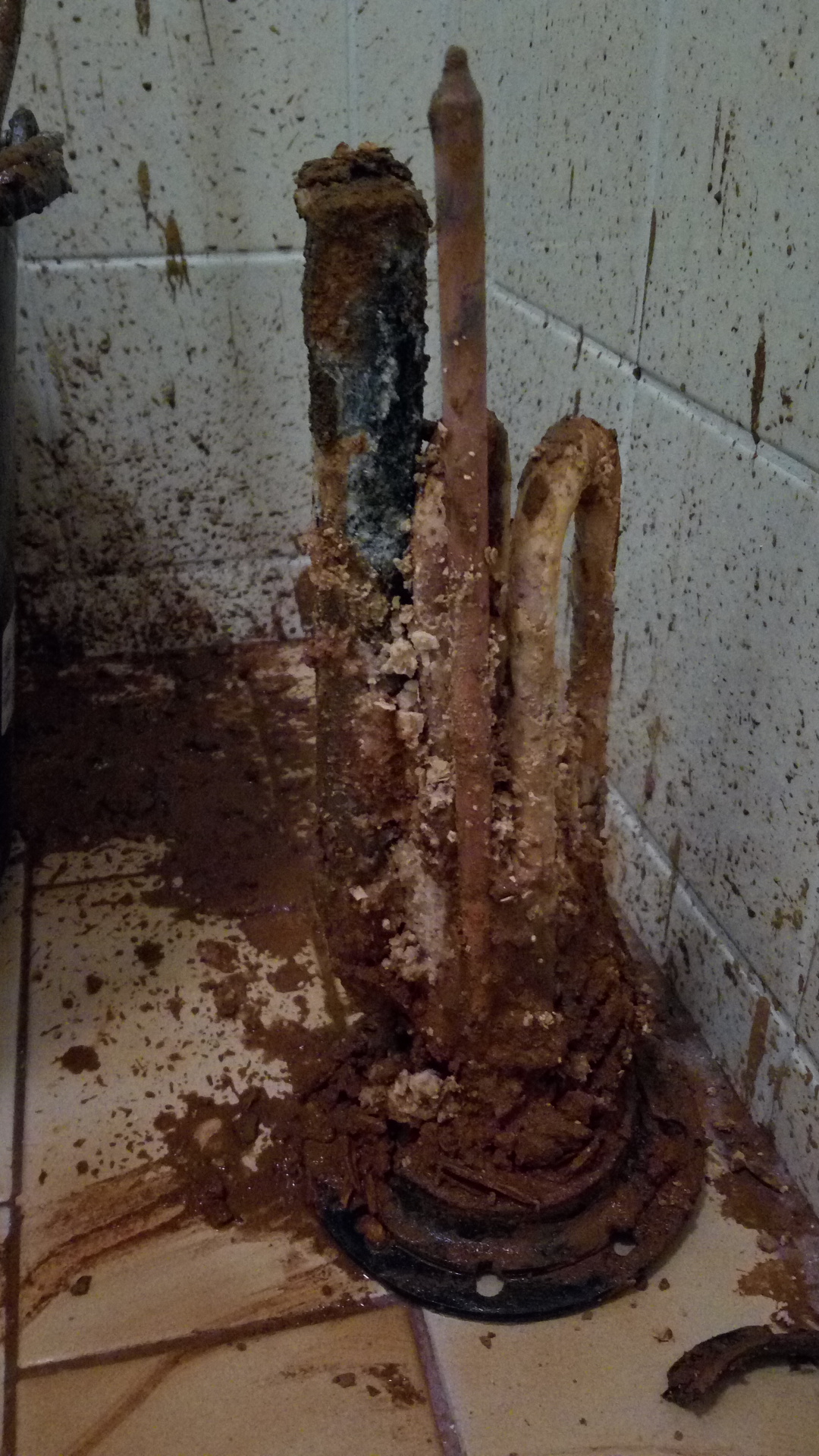 Ez a rozsdamennyiség nagyon durva. Nincs mihez viszonyítani azoknak a csavaroknak a méretét, de így ránézésre egy mosdókagyló felrakásához is nagyobb kell. Pedig abban nincs 120 liter víz.