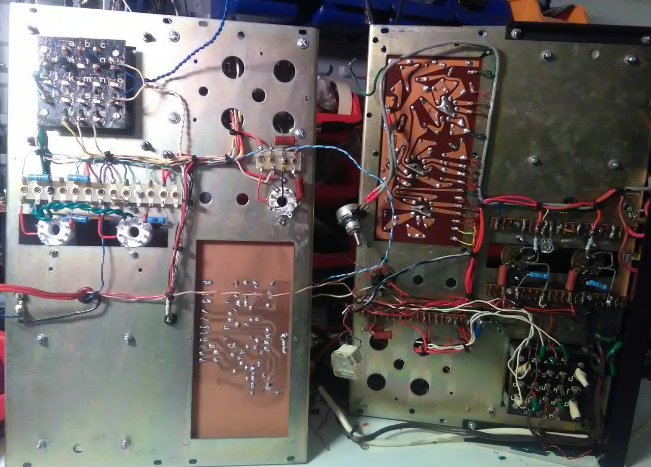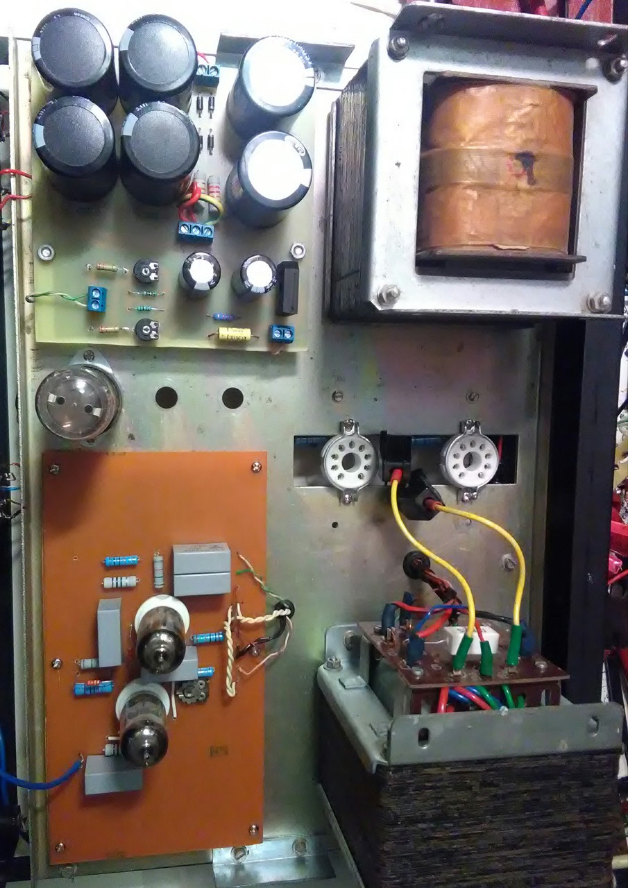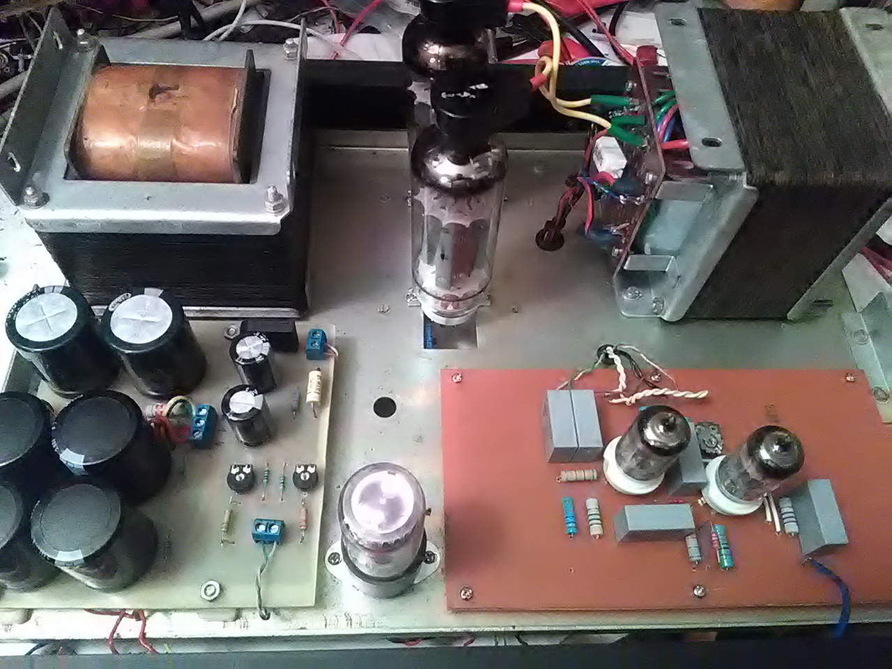 Az egyik elkészült. A csöveim ebben is ugyan azt mutatják. A hálózati trafó kivételével minden új. A főkapcsoló hátra került, az eredeti kapcsolóval az anód kapcsolható. Az előlapon nem lesznek feliratok. Hátul az eredetit használtam fel.