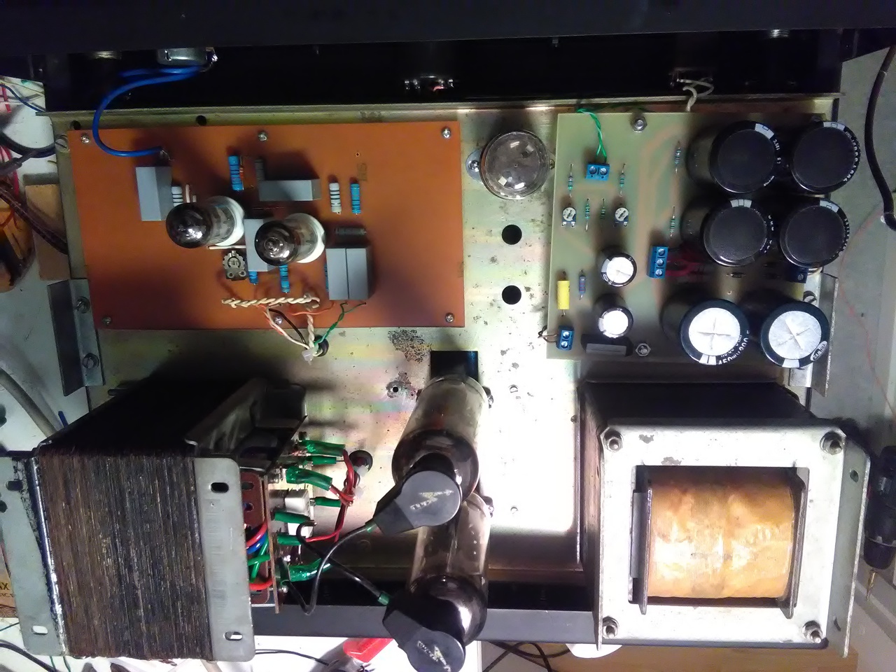 Na elkészült. Először rátekertem a trafóra két menetet zománcozott huzalból. 1,2V-al nött a feszültség. Ebből jött hogy kb 10 menet kell. Keservesen rátekertem. De testzárlatos lett. Levágtam. Közben rájöttem hogy az új potméter nem jó. Az szivatott. Illetve a hálózat is rendben van (most). Most minden jó. A nyugalmi áramom 30mA. Az általam tervezett panel tökéletesen működik. Max hangerőn alig hallani brummot. Erősen kell fülelni. 1 KHz szinusszal meghajtva, kb 80 W-nál kezd torzulni a jel. 4 Ohmos terheléssel 112W-ot ad le, 8 Ohmnál 105 W (21,2 V és 29 V). A nyugalmi műszere nem tökéletes. Ha rákapcsolom az 1 Ohmos ellenállásra, multival csak a felét mérem a beállítottnak, és a műszer is csak a felét mutatja. Most 30 mA-nél csak KB 15-öt mutat. Ez nem gond mivel csak tájékoztató műszer. Az eredeti sem volt jobb. Azért veszek bele új csöveket. Most nekiállok a másiknak is.