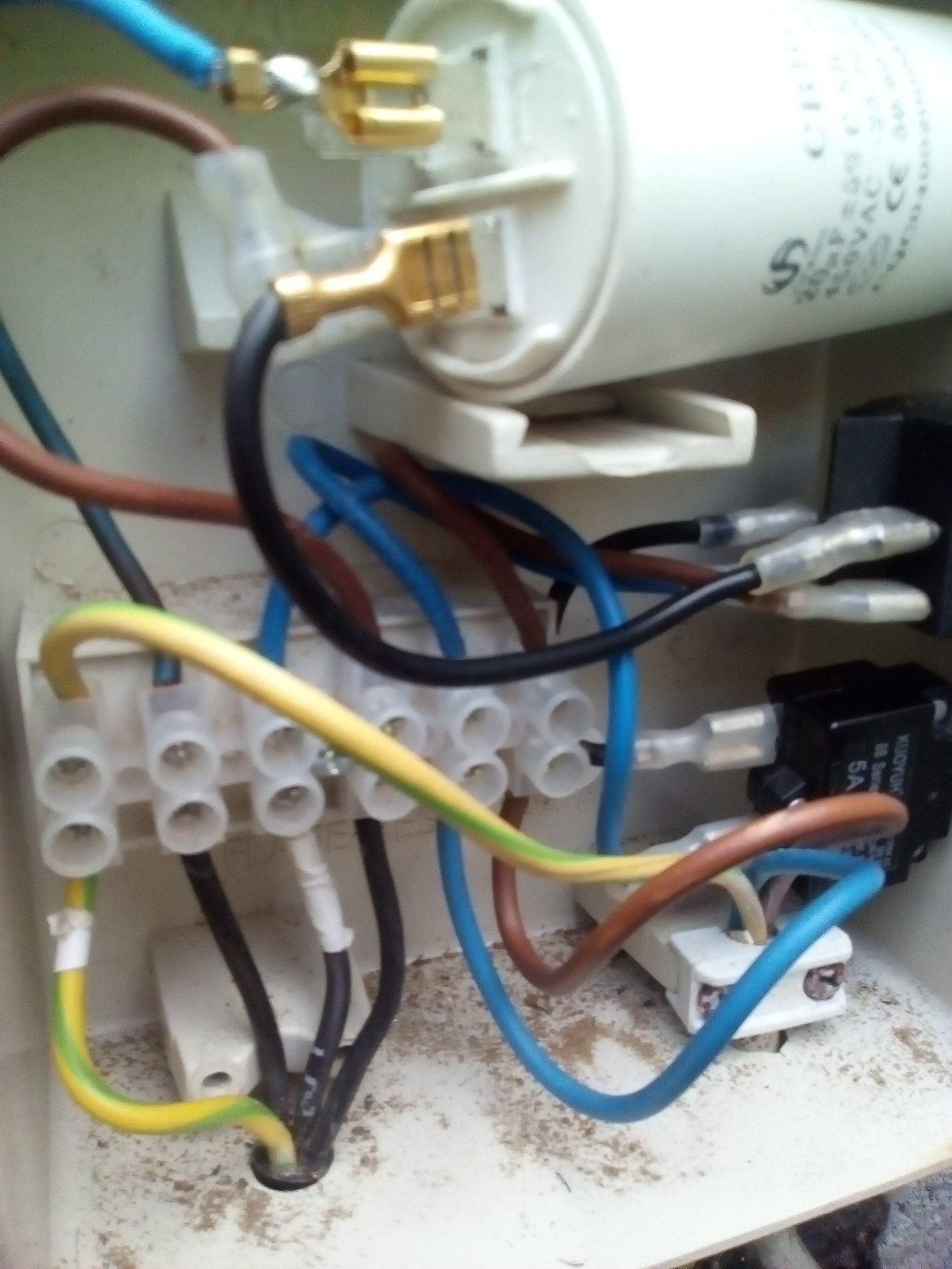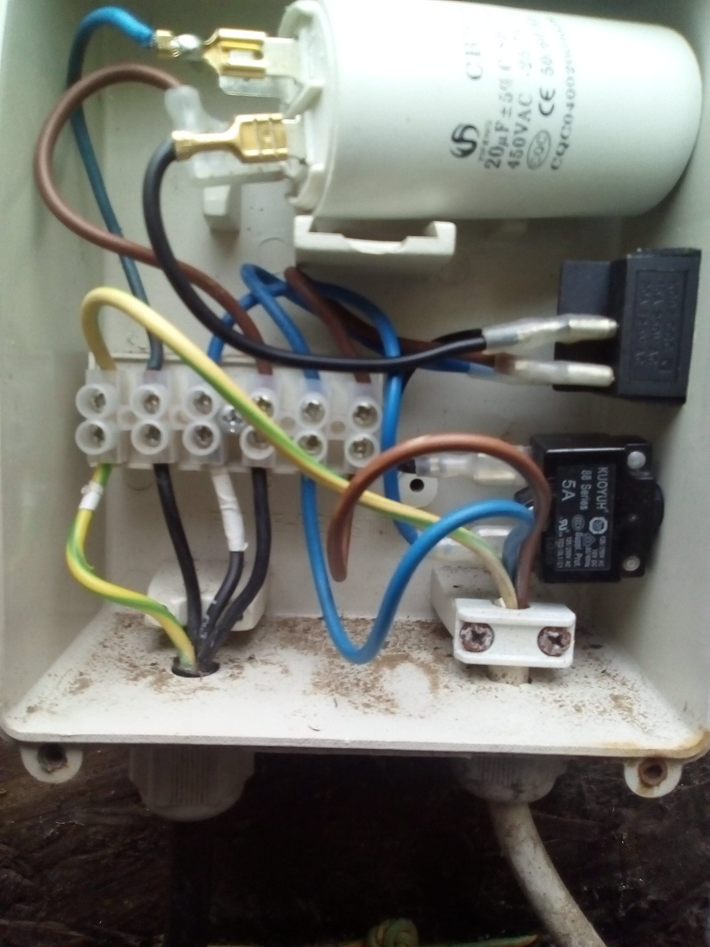 kék: fázis(230), barna: közös, zöld-sárga: föld. Az alsó 5A-es 'doboz' a hőkioldó, felette kapcsoló és ugye a segédkondi 20mikroFarados.A házból a 230 először a felső kapcsolóba megy(kék) és onnan a hőkioldóba(rövid fekete) és onnan a csokiba(kék). Nagyon el van cseszve, vagy van még esélyem? ![]() doboz, bekötés 1. doboz, bekötés 2.