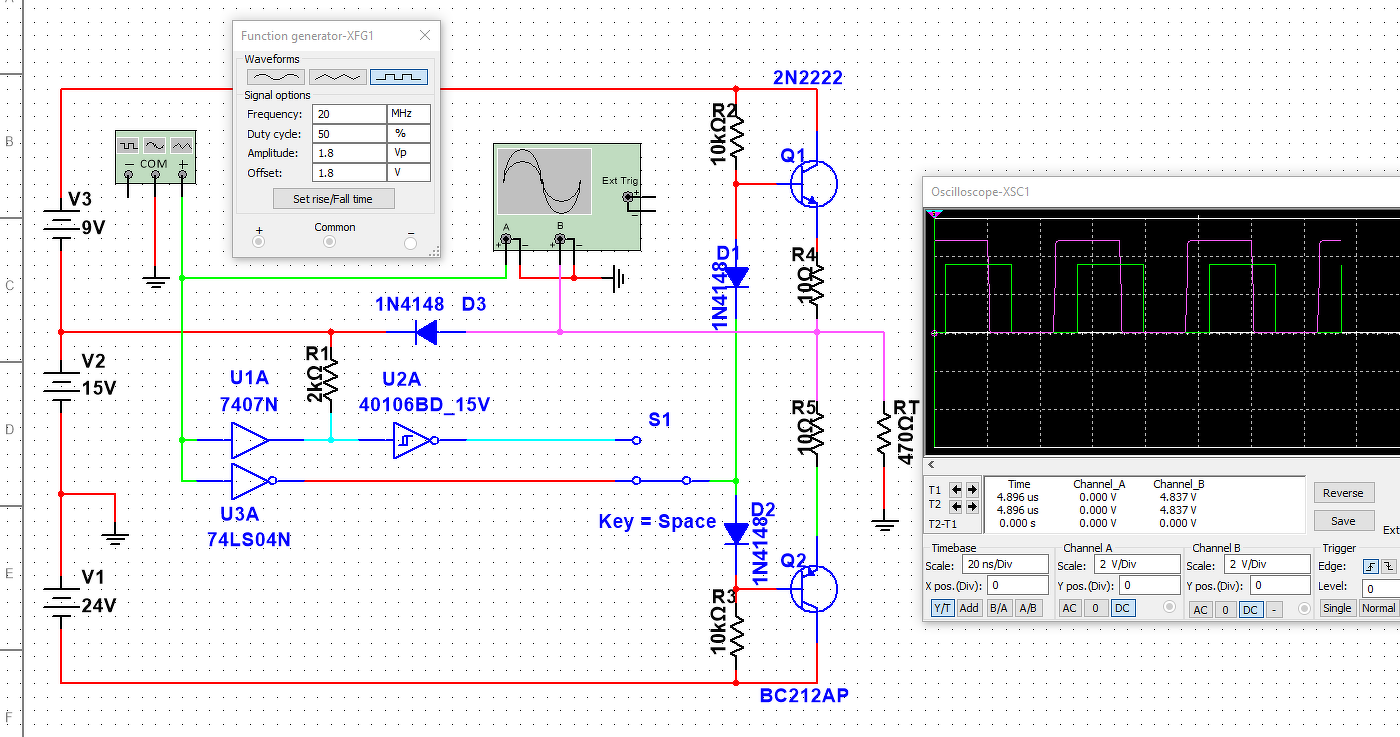 Kipróbáltam a javasolt IC-ket, meg még másik hármat. Legjobban az 5539 jött be; ez van a boltban is, meg a fiókban is... Az OC TTL IC 74LS07 lesz a gyakorlatban, de a szimulátor könyvtárában található 7438-al elfogadhatóan működik 20 MHz-ig is. Talán kár erőlködni a MAX038-al, mert 20 MHz elérhető (elvben) 74LS14 inverter oszcillátorral is, aminek egészen más a beszerezhetősége, meg az ára. Nyilván a stabilitása is... Köszönöm mégegyszer! Jó éjt!