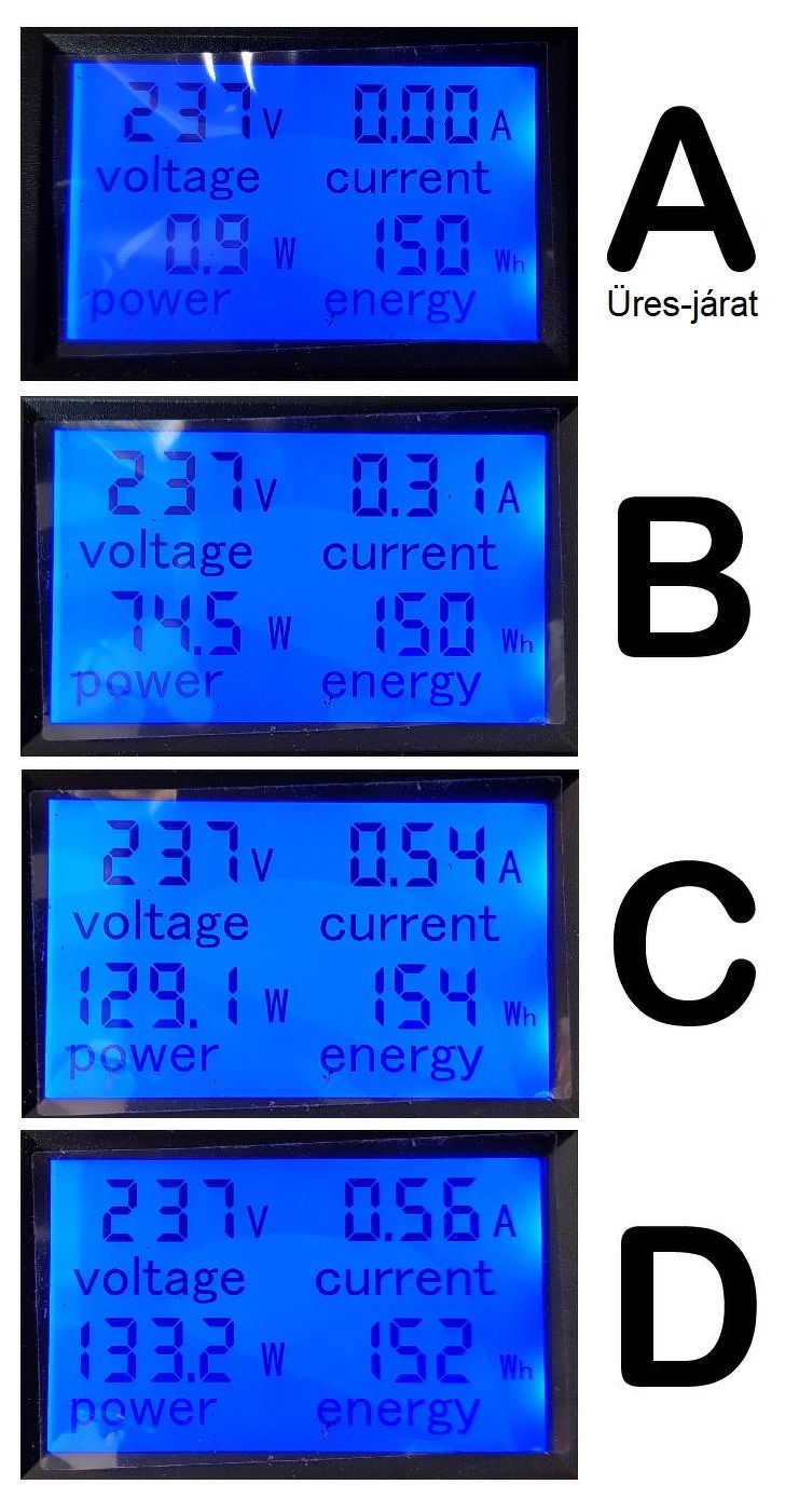 A mellékleten lévő adatok egy 120 VA-es transzformátor néhány terheléséhez tartozik. A feszültség, áram és teljesítmény szépen szinkronban van, azokkal semmi gondom nincs, de a jobb alsó sarokban lévő kb. 150 Wh értelmezését keresem. (Az A-képen lévő valós áram 4 mA, ezért mutat nullát.) Nagyjából független a terheléstől az érték, és pl. a C ábrán nagyobb az érték mint a D-n, pedig a teljesítmény az utóbbinál nagyobb. Mi a helyes értelmezése ennek az értéknek?