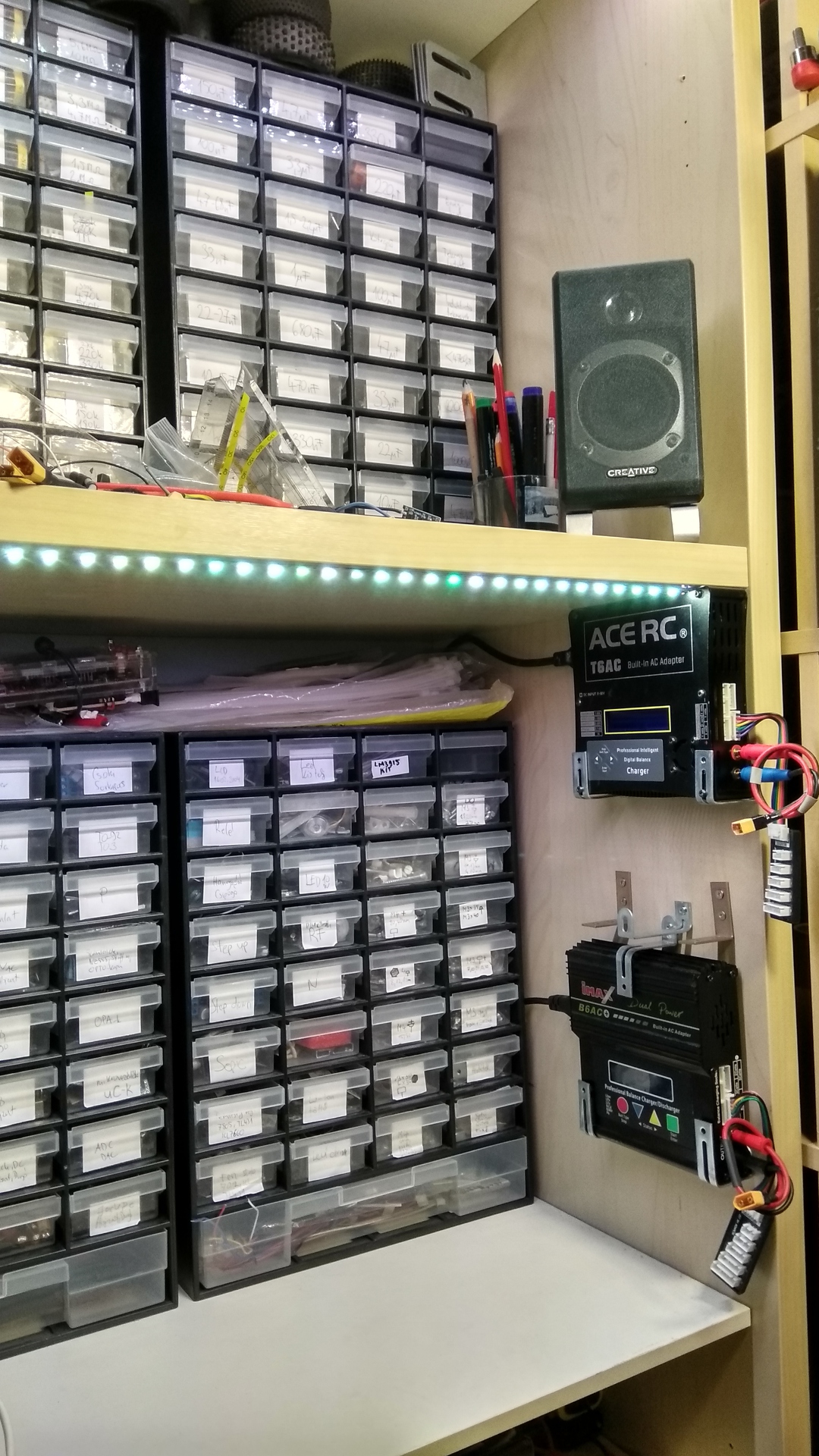 Szeretném bemutatni a műhelyem egy részét, mégpedig az alkatrész tároló szekrényt. Távirányítós RGB LED-szalag világítja meg a polcokat, a két lipo akksi töltőt most szereltem fel. Sokkal több helyem van, átláthatóbb, szebb, mint amikor csak le vannak a polcra téve, mellettük pedig az akksi. Egy creative 5.1 hangrendszer segít a gondolkozásban.