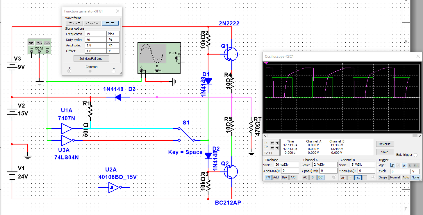 Kipróbáltam a javasolt IC-ket, meg még másik hármat. Legjobban az 5539 jött be; ez van a boltban is, meg a fiókban is... Az OC TTL IC 74LS07 lesz a gyakorlatban, de a szimulátor könyvtárában található 7438-al elfogadhatóan működik 20 MHz-ig is. Talán kár erőlködni a MAX038-al, mert 20 MHz elérhető (elvben) 74LS14 inverter oszcillátorral is, aminek egészen más a beszerezhetősége, meg az ára. Nyilván a stabilitása is... Köszönöm mégegyszer! Jó éjt!
