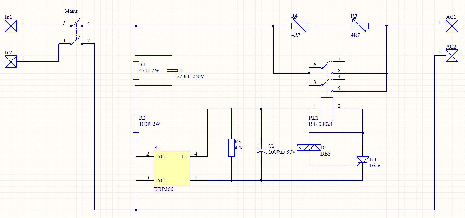 Én olyat csináltam, hogy a főkapcsoló tartja a Skori-féle lágyindítót. Lehet, hogy nem jó, de ötletnek sem biztos, hogy jó. A kapcsoló (isostat jellegű, régi pc tápkapcsoló) a lomax-ban van 100 Forintocskáért. Van még egy led is rajta előtéttel, csak a kapcsoláson nem van rajta. A csatlakozások csúszósarusak.
