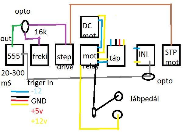 Helló! Működik az általad mellékelt kapcsolás. Annyi kérdésem lenne a dologhoz, hogy a mellékelt bekötési ábra szerint van egy gépezetem megvalósítva. A kérdésem az lenne,hogy a rajzon van egy lábpedál. Mikor ezt lenyomom vagy elengedem akkor az 555 kimenete elbillen. Pont ugyan úgy mint mikor triggerel az iniciátorral. Valószínűleg a relé rezgő nyelve zavarja az IC-t az éteren keresztül. A végeredmény hogy a főorsó pedál hatására lép a léptetőtmotor nem pedig csak az ini jelére, és nem is csak egy lépést. Jelenleg a kapcsolás próba panelen az asztalon keresztül kasul van kábelezve. A problémát megoldja az árnyékolt kábeles fémházas bekötés? Vagy érdemes lenne valami féle szűrő tagokat beiktatni? Triggerbe próbálkoztam soros RC kör bekötésével de nem hozott eredményt.