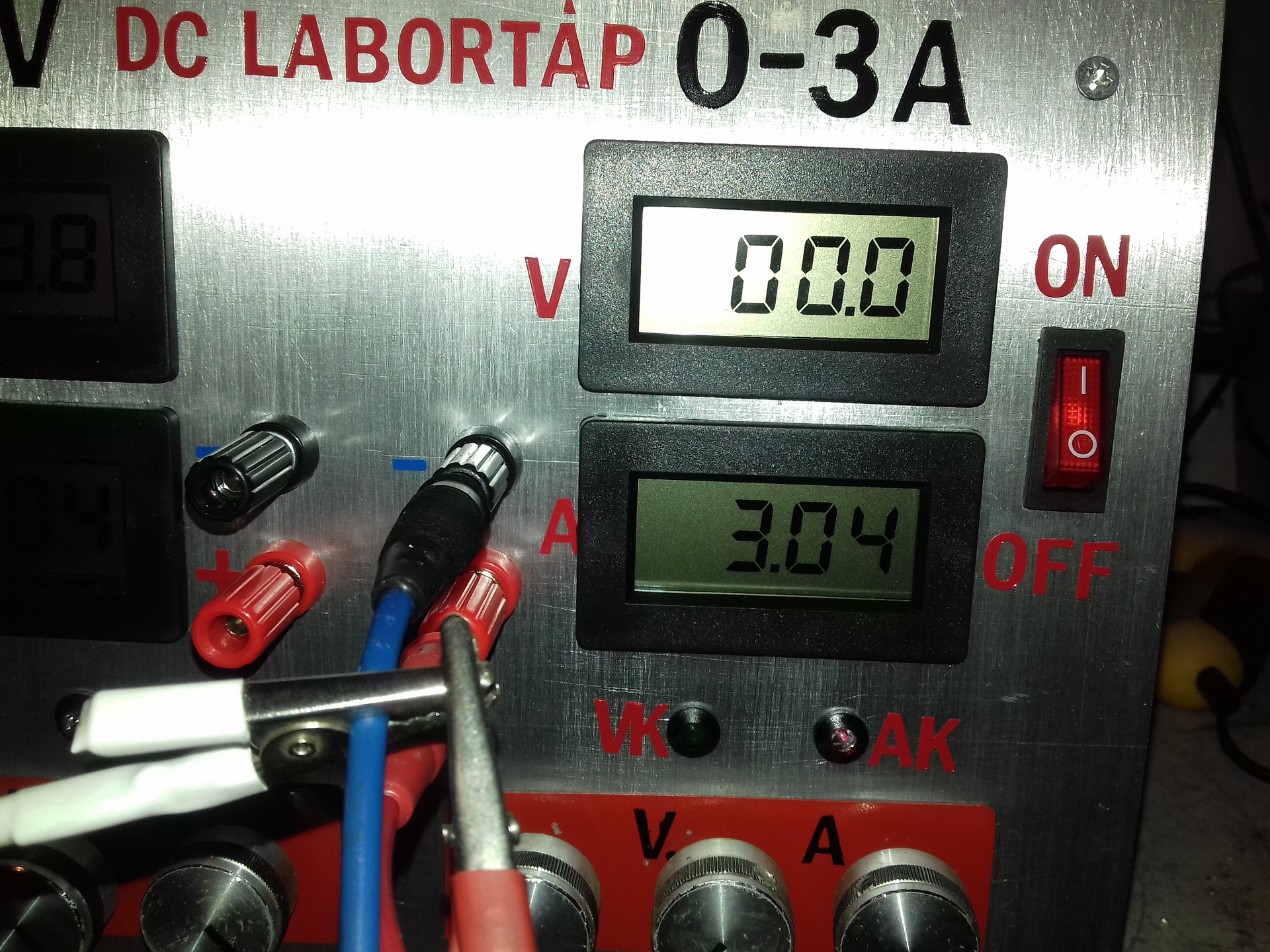 Egy áramkorlátban, egy DC OFF és egy "felcsavarva csutkára". A kék még mindig fényesebb kissé, de mostmár így marad. Pontos, jól működik és "visszaáll" a beállított értékre. A felhasznált alkatrészeket figyelembe véve az ár/érték arány is elfogadható.