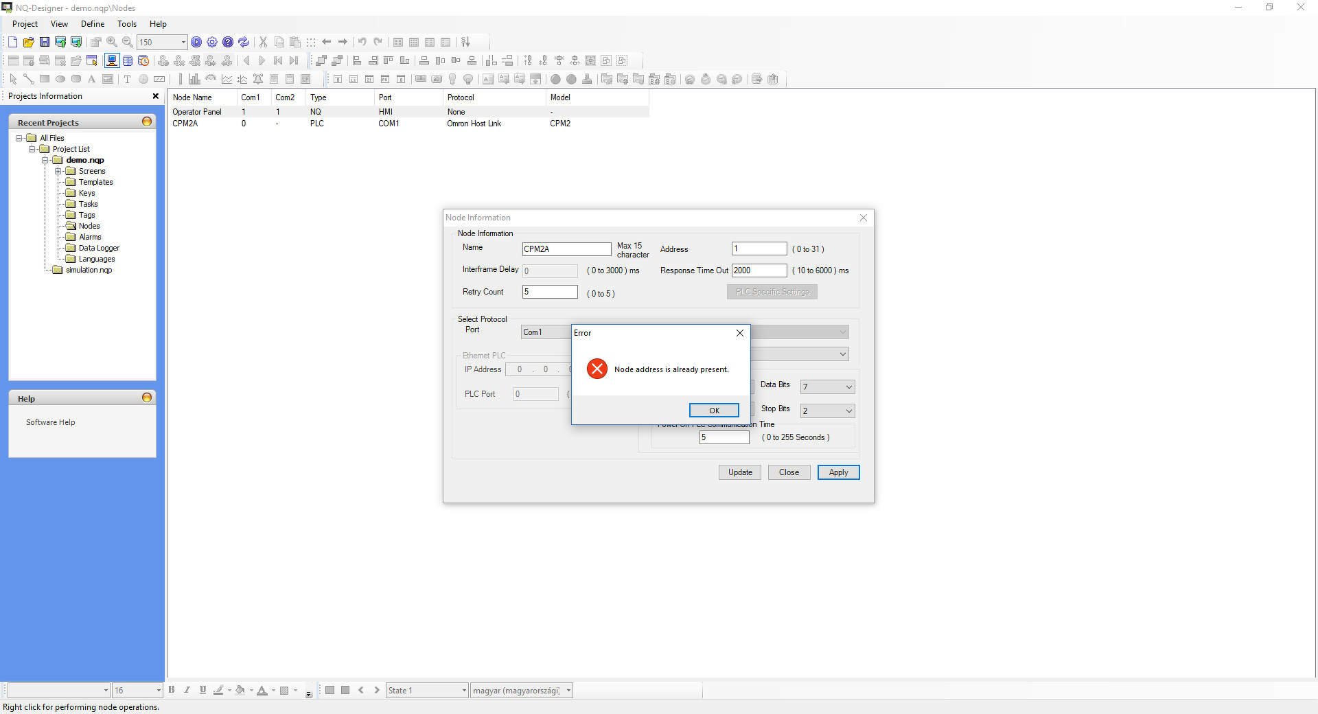 Nodes menüben az address szintén 1 legyen (NQ designerben) de lehet bármi más, csak egyezzen a két eszköz beállításában.