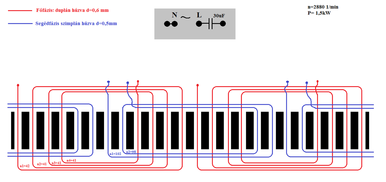 1-2 menet nem számít, de ha befér, mindegyiket felkerekítheted. Akkor maradhatnak a huzalátmérők. Üzemi kondenzátorral működik a motor?