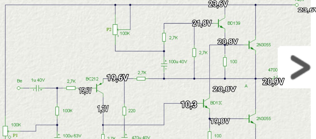 A BC212 ugyan ez alapján hibásnak tűnne, de itt a mérőeszközöd belső ellenállása vihette el a bázis feszültségét. Ha lett volna a kimeneten egy voltmérő az jelezte volna a feszültség megváltozását. A BC212-t követő BD139 bázisfeszültsége sajnos nem értelmezhető, mert a BC212 kollektorfeszültségével meg kell egyezzen, hiszen össze vannak kötve. Amennyiben mégis a mérés bizonyul helyesnek, akkor ott szakadás van amit meg kell szüntetned. Ezen BD139 emitterfeszültsége szintén irreális. Egyrészt a 100 Ω izzana tőle, másrészt a hozzá kapcsolódó 2N3055 19,8 V bázis-emitter feszültségkülönbsége egyértelműen hibás, vagy bekötetlen tranzisztort mutat. Kérlek ismételd ennek a BD139-nek a mérését!