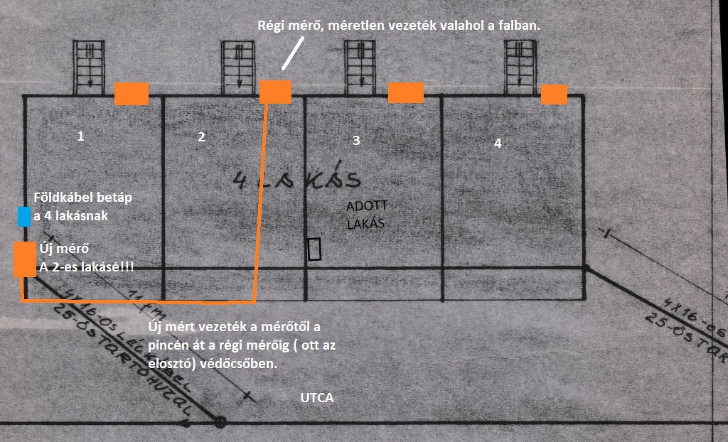 Csak úgy érdekességképpen: Hát én ugyanilyen háznál láttam valamit!! Ugyanúgy 4 lakás. Rajzoltam a képedre, csatoltam! A földkábel az első lakás oldalán megy egy alu tokozatban( 30 éves). A régi mérők a bejáratoknál vannak. A 2-es lakásnál bővítés volt, az új mérőt feltették az első lakás falára, falonkívüli doboz, a mért vezeték pedig szintén falon kívűl védőcsőben ( a ház utcafrontján !!, kerítés nincs) bemegy a pincébe, a pincén át a régi mérőhelyig. Csodálatos megoldás!!??
