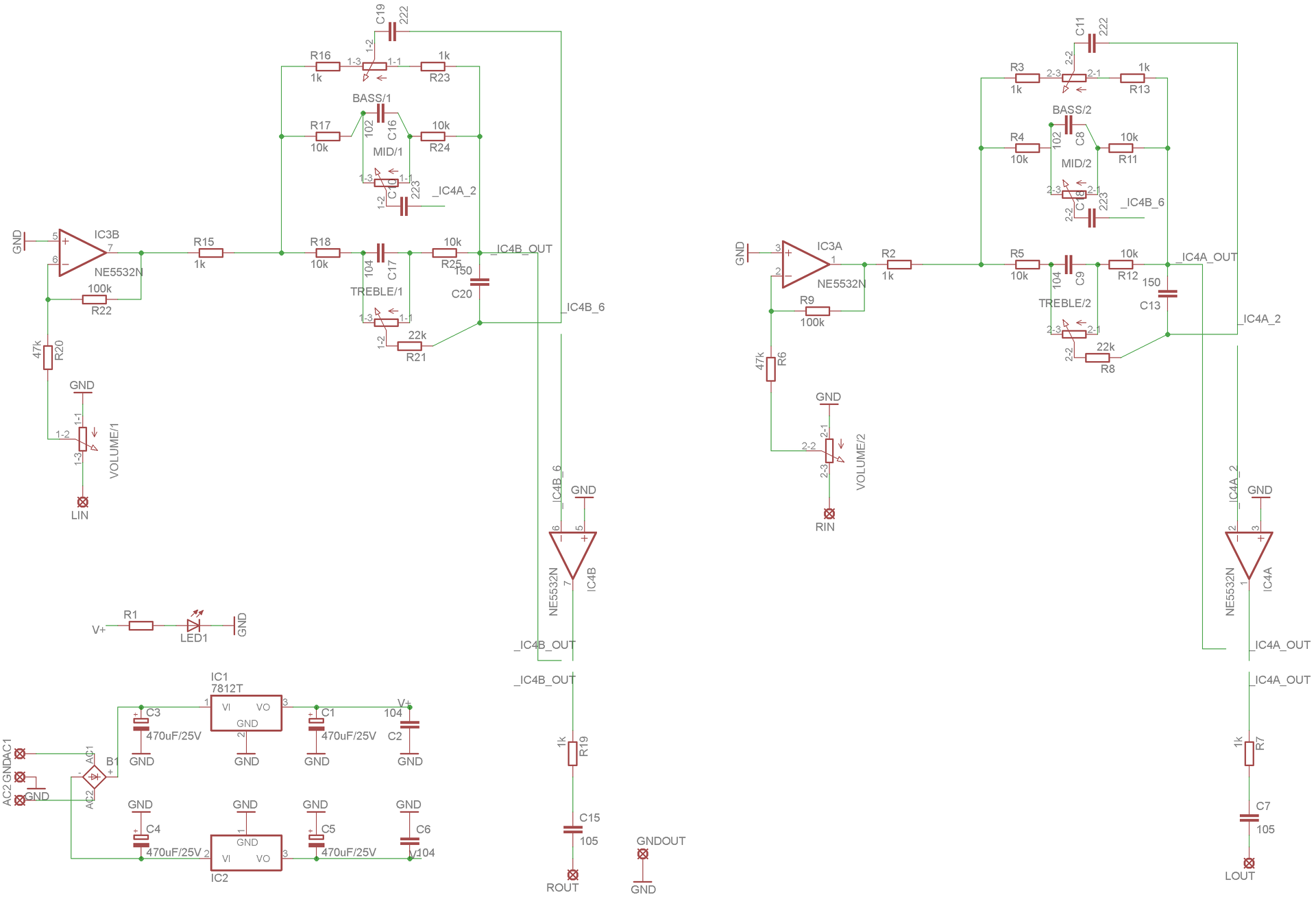 Lehet hogy van benne hiba, próbáltam a tökéletességre menni. Ami nekem feltűnt, hogy a mid szűrőköre mintha kereszbe lenne rákötve az erősítőre. Ettől még nem értem miért nem megy rendesen. A rajzon pár helyen meg van szakítva a vezeték, ezt az átláthatóság kedvéért tettem, de mindenhol oda van írva a vezeték neve. A panel alsó része teljesen megegyezik az igazival, a tápnál csaltam egy kicsit, mert nincs álló 7912 a könyvtárban. Párhuzamosan rajzoltam mindkettőt hogy kevesebb legyen a hibalehetőség. Ettől még van benne eltérés, mert mintha három rétegű lenne a panel, pár vezetéknek nyoma sincs, pedig összesípol. Szóval biztos van benne amit nem vettem észre, de legalább látszik hogy mégis mi ez. Kérlek mondjatok valami okosat hogy mit csináljak vele! Üdv! A hozzászólás módosítva: Nov 4, 2018