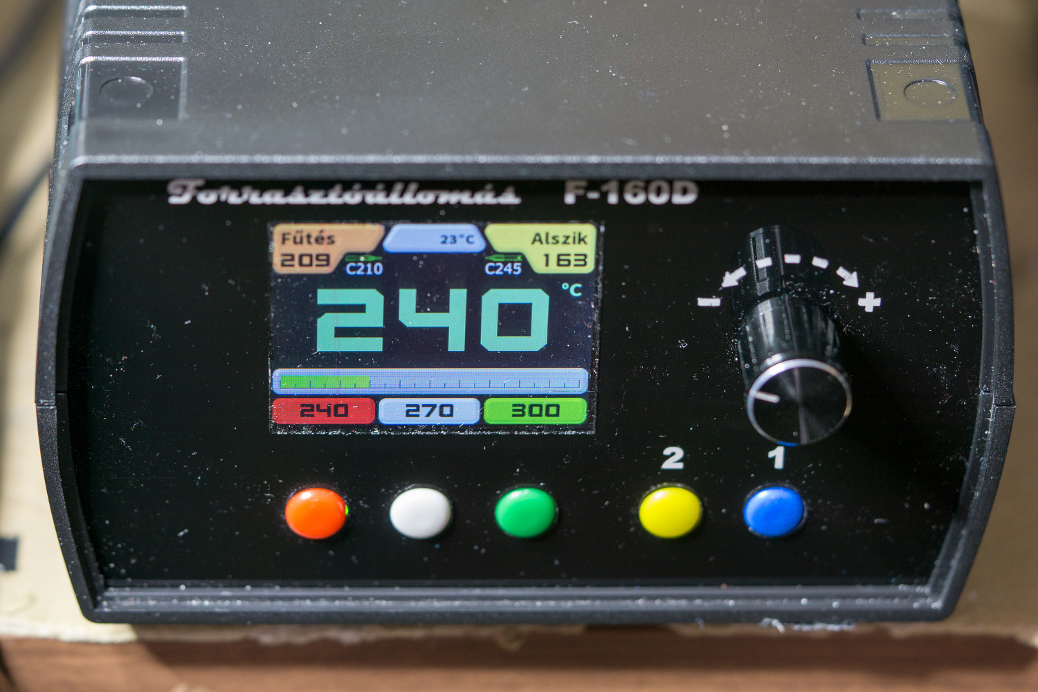 Építettem egy 160W-os forrasztóállomást. Két darab T210, illetve T245-ös JBC pákát lehet hozzá csatlakoztatni. A pákák egyszerre is használhatóak. Nagyon gyorsan eléri az üzemi hőmérsékletet a pákahegy (3mp). Aki használt már JBC állomást az tudja mekkora a különbség egy hagyományos állomáshoz képest. Az állomás számítógéphez csatlakoztatható USB-n keresztül (galvanikusan leválasztott a csatlakozás az állomás többi részétől). A vezérlést és képernyőkezelést egy STM32F405RGT6 mikrokontroller végzi (ARM Cortex-M4). A szoftver még nem teljesen kész (vannak még további ötleteim). Az előlap is csak ideiglenes, várok egy szerszámra, amivel pontosabban körbe tudom vágni a védőfóliát a plexin festés előtt. Teszek majd fel képet a végleges állapotról később.