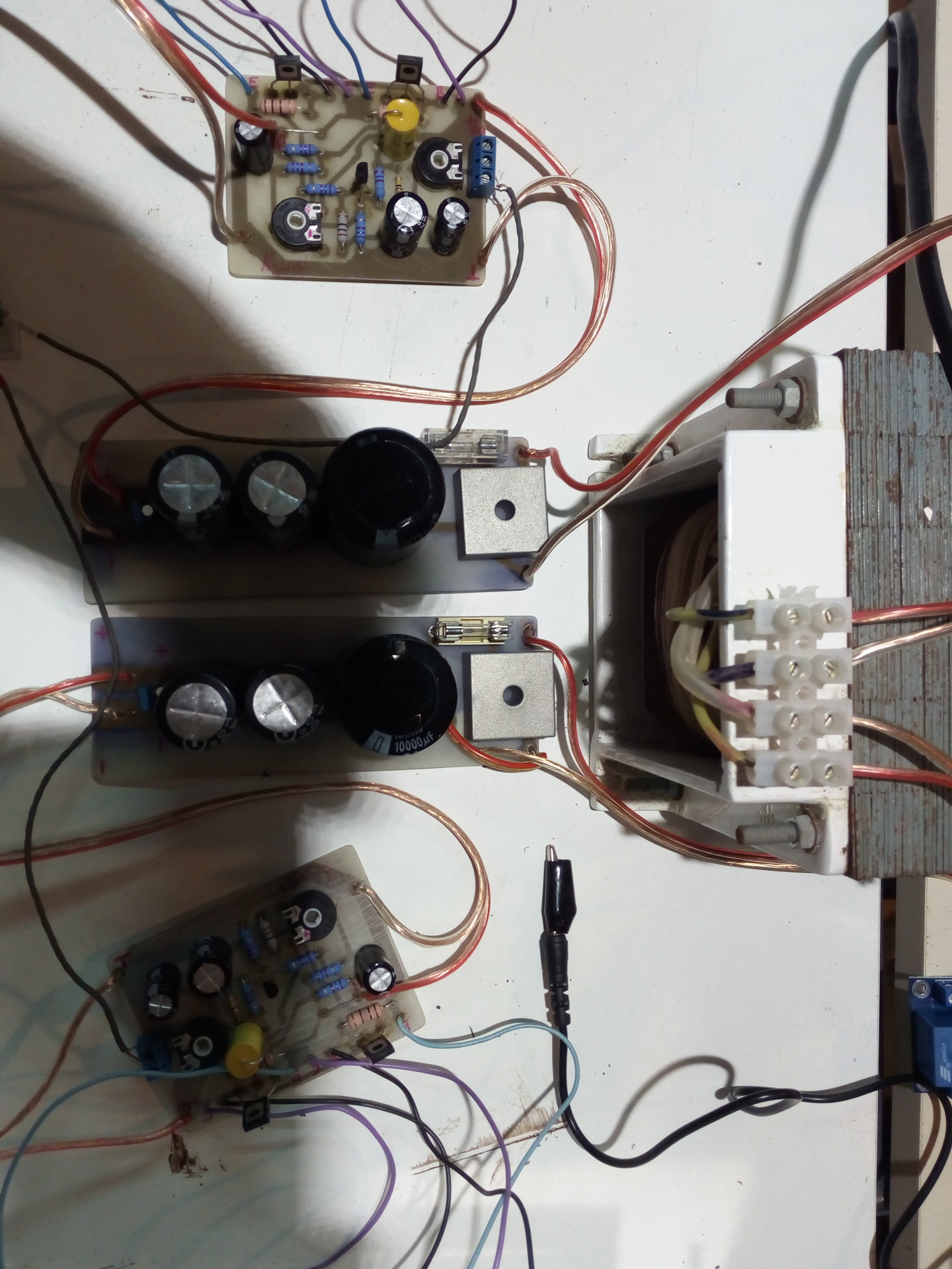A kép még előtte készült, csak odapakolgattam mindent, ma kötöttem össze a végfokkal a kicsatoló kondikat.A képen még sehonnan nem kap feszt, azt is ma kötöttem be. A trafónak két szekundere van, 2x17 volt. Holnap rakok fel képet a jelen állásról, már dolgozom.