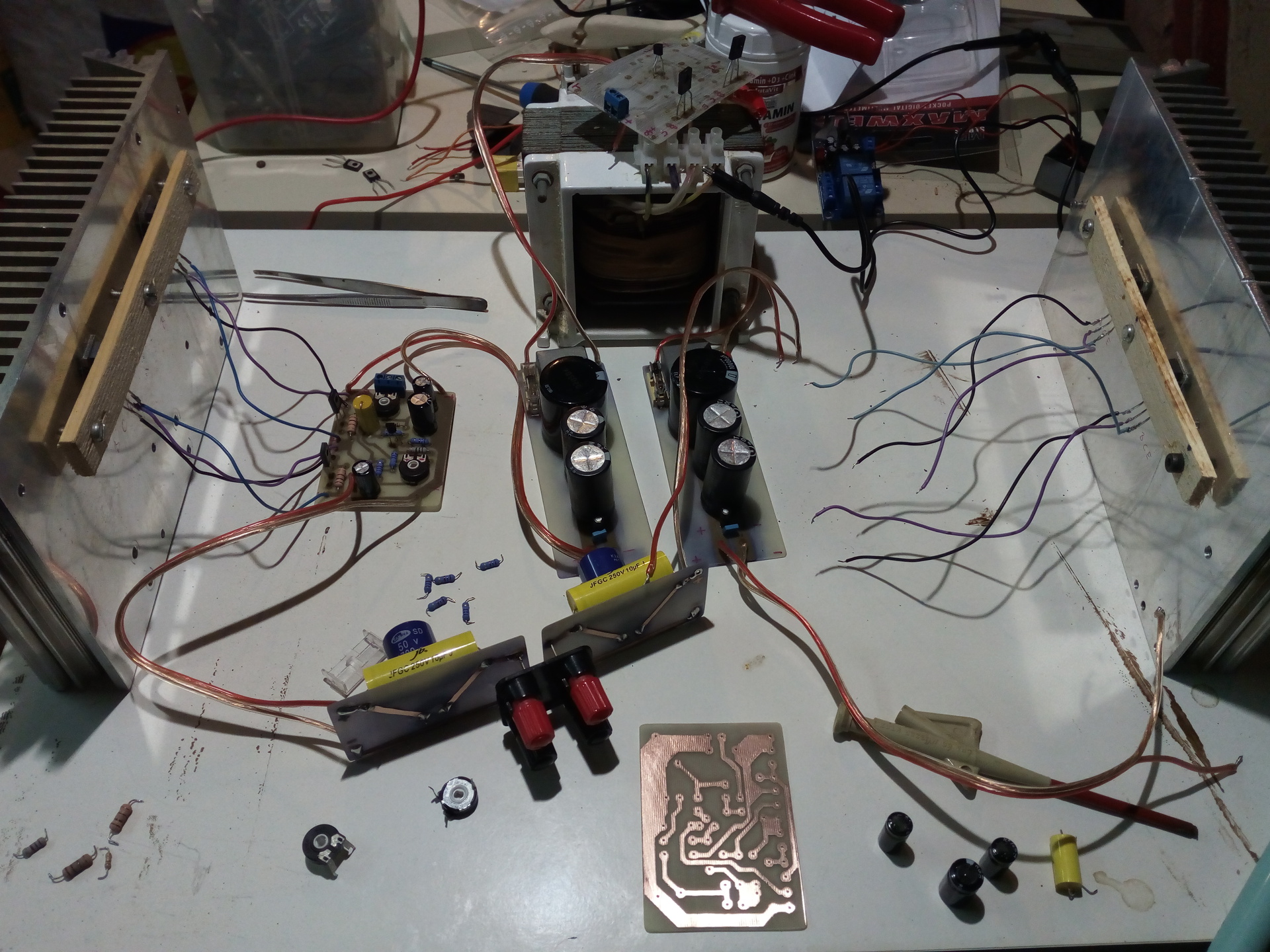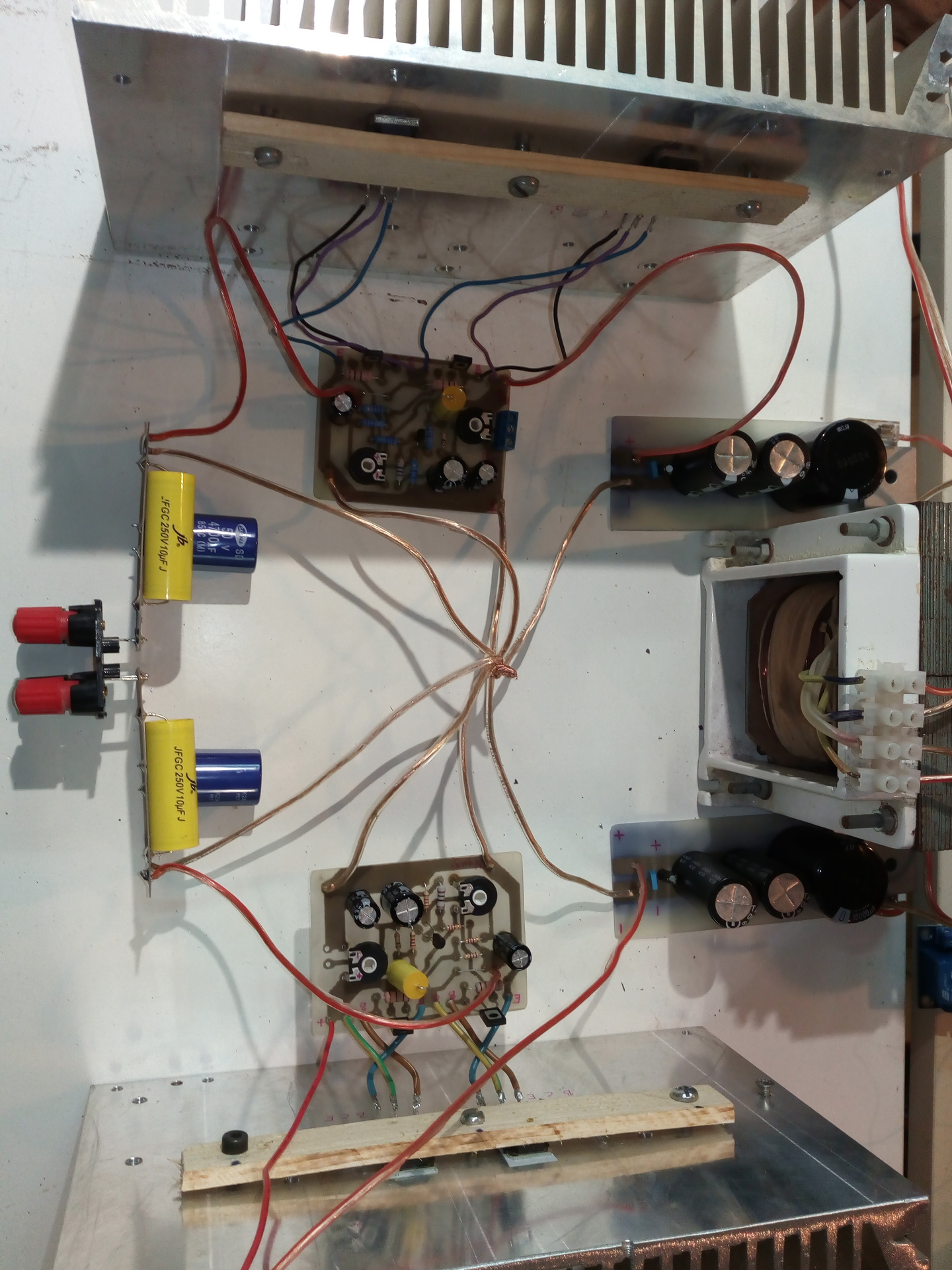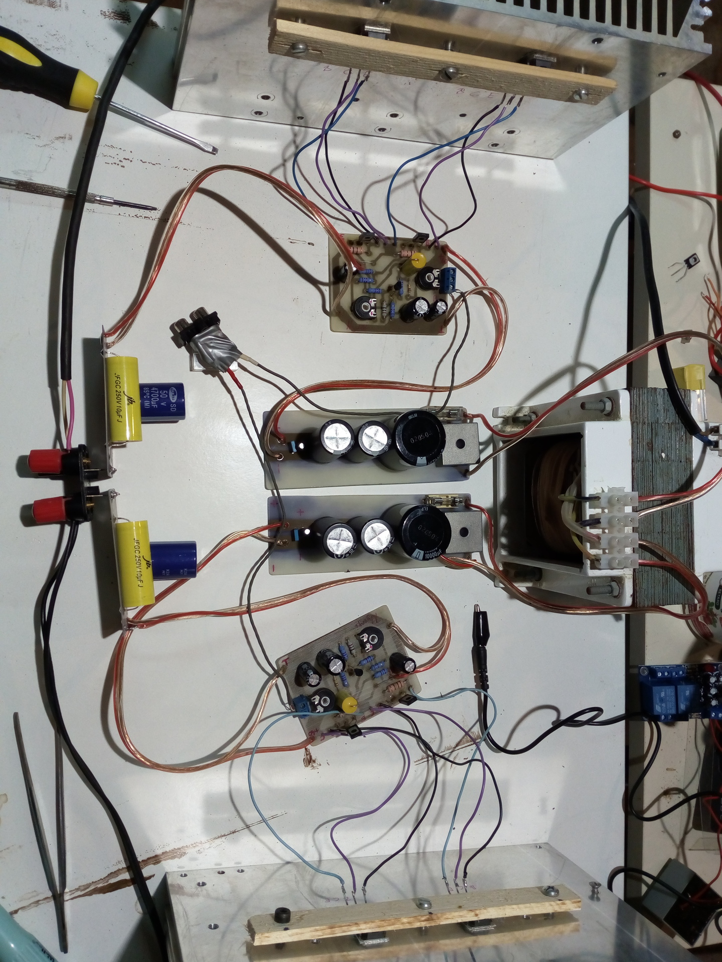 Üdv.! Jelen állás a képen. Alakulgat. Természetesen a fenyőléc, meg a tranzisztorok kábelezése nem végleges. Gondolkodom az elrendezésen, meg hogy miből legyen a doboza. A tápból hiányzik még 2 kondi, mert nem volt a boltban. A trafót is majd lehet, hogy kicserélem. Jó a teljesítménye, de csak 2x24volt.