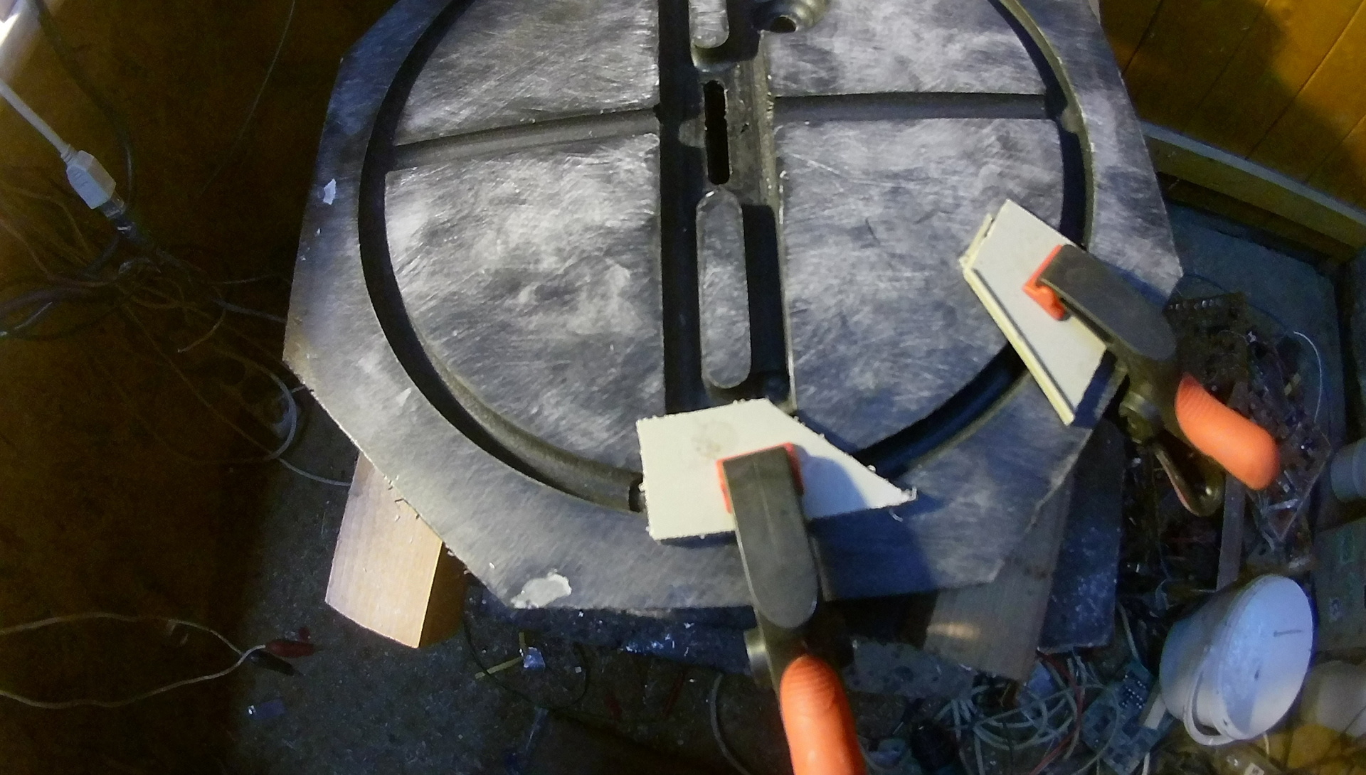 Sziloplaszt helyett használhatsz gyári formaleválasztót, esetleg szilikon spray-vel befújod, és akkor sem tapad bele a gyanta. De ha szilóval kened be a belsejét, akkor lesz a sablon belsejében egy rugalmas réteg, amiből könnyen kijön a kész fej. Nekem a műanyag sablonból 5 perc kocogtatás után jön csak ki a fej, mert kissé belezsugorodik. Tökéletesen benne van és noha nem tapad bele, mégis nehéz kiszedni. Olyanokra figyeljél, hogy tudjad valamiképpen azt biztosítani, hogy a tekercsek nehogy kiálljanak a gyanta síkjából. Mert ha csiszoláskor belecsiszolsz a tekercsbe, vagy a vezetékbe, akkor nagyon szomorú leszel. Én ezt a képen látható módon biztosítom. A tekercsre teszek egy üvegszál-csomót, majd műanyag lap és csipesz. Az üvegszál csomó a sablon szintje alá szorítja a tekercseket.