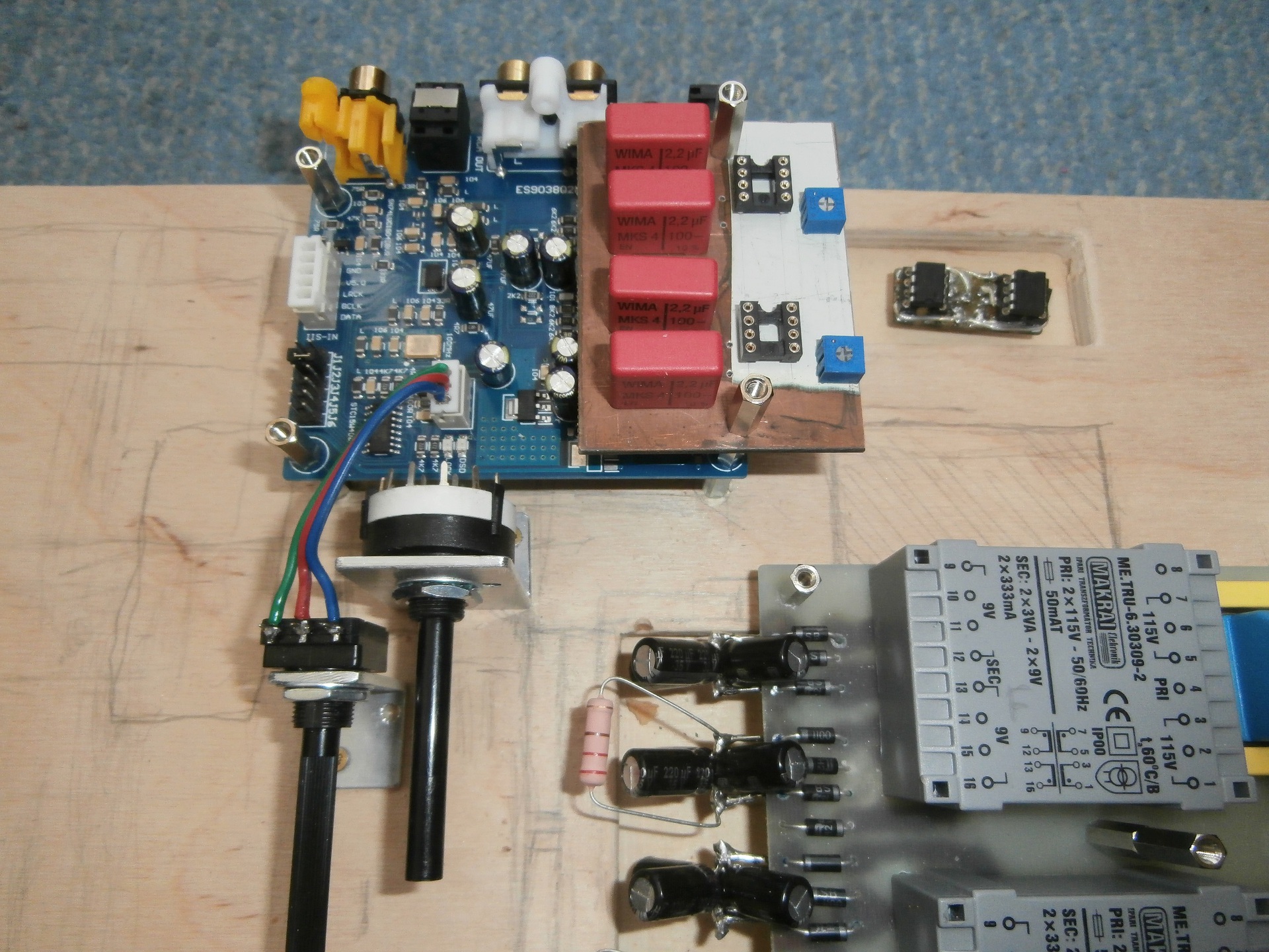 Hát először is logaritmikus monó 10K-t kellett volna vennem, digitális szabályzás ide vagy oda. Ezzel spórolhattok rajtam kívül. No meg a balról jobbra forgatásnál a hangerő növekedést elvárva, ha a tengely feléd irányul, és a poti lábai az égnek merednek, a baloldal kivezetését a poti panelcsatlakozójának ledes oldalára kössed. Adódott egy kis időm tesztre, hát becsatlakoztam az YJ-es9038q2m DAC 3,5 jack-jébe a Maxell-al (32ohm), és a K701-el (72 ohm). A hangerő szabályzó jelenléte ebben az esetben fontossá válik a felvételek eltérő kivezérlési szintjei miatt, mert az halláskárosodást, vagy a hallgató károsodását okozhatja. Nos, szerintem a 72 ohmos hallgatót is hangosan tudja megszólaltatni. Az YJ-ES9038q2m hallgató csatlakozója jól használható monitorozásra minden külön eszköz nélkül. Csodát azonban ne várjunk tőle. Szűkebb a tere, nem olyan szelektív, és nem olyan szellős, mint nálam a FH6-300-al, az RCA-k-hoz csatlakozva. Akadozó alkatrész beszállítás miatt ideiglenes megoldást keresve az analóg fokozat elkészítésébe fogtam. Ehhez KT FH7-es készülékének bemenő fokozatát plagizáltam (tkiraaly, audió). Azonban felmerült bennem egy fájó probléma, hogy csak az I2S port tud DSD256-ot. Nekem USB felület nem igazán kell. Viszont örömmel töltene el, ha hallhatóvá tudnék tenni párszáz MB-os file-okat. Szóval Fórumtársaim, jó lenne egy kis segítség, hogy hogy lehet még egy optikai portot tenni az YJ-ES9038q2m I2S interface-re. Előre is megköszönöm az ez irányú segítségeteket!