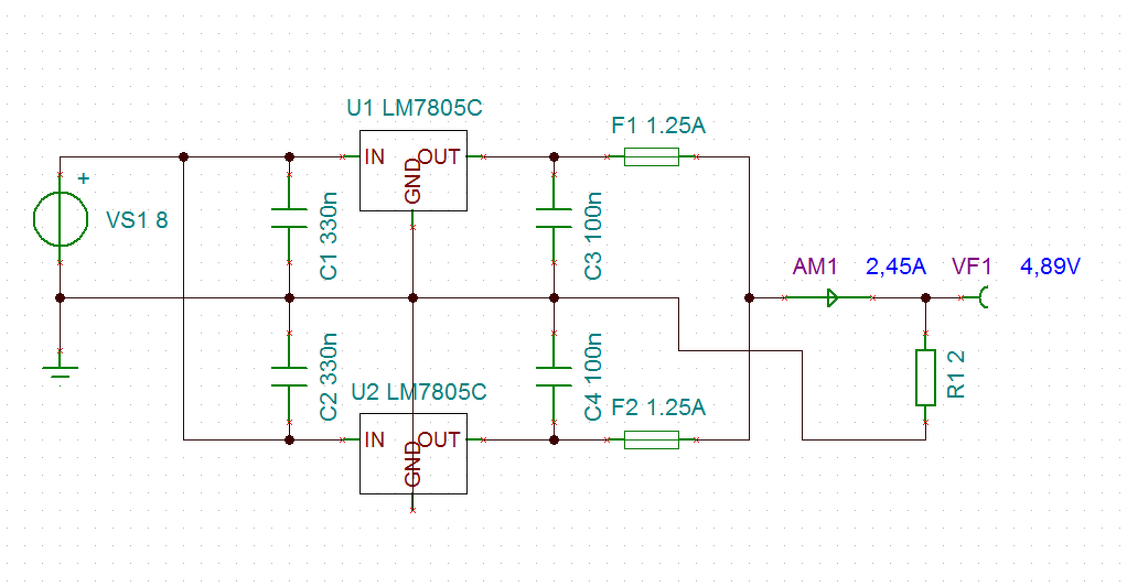 Ha a bemeneti feszültség nem elég magas, 7805 és variánsai helyett LDO -t kell alkalmazni. Itt egy cikk olvasható a párhuzamosan kötött LDO -k közötti terhelésmegosztásról.