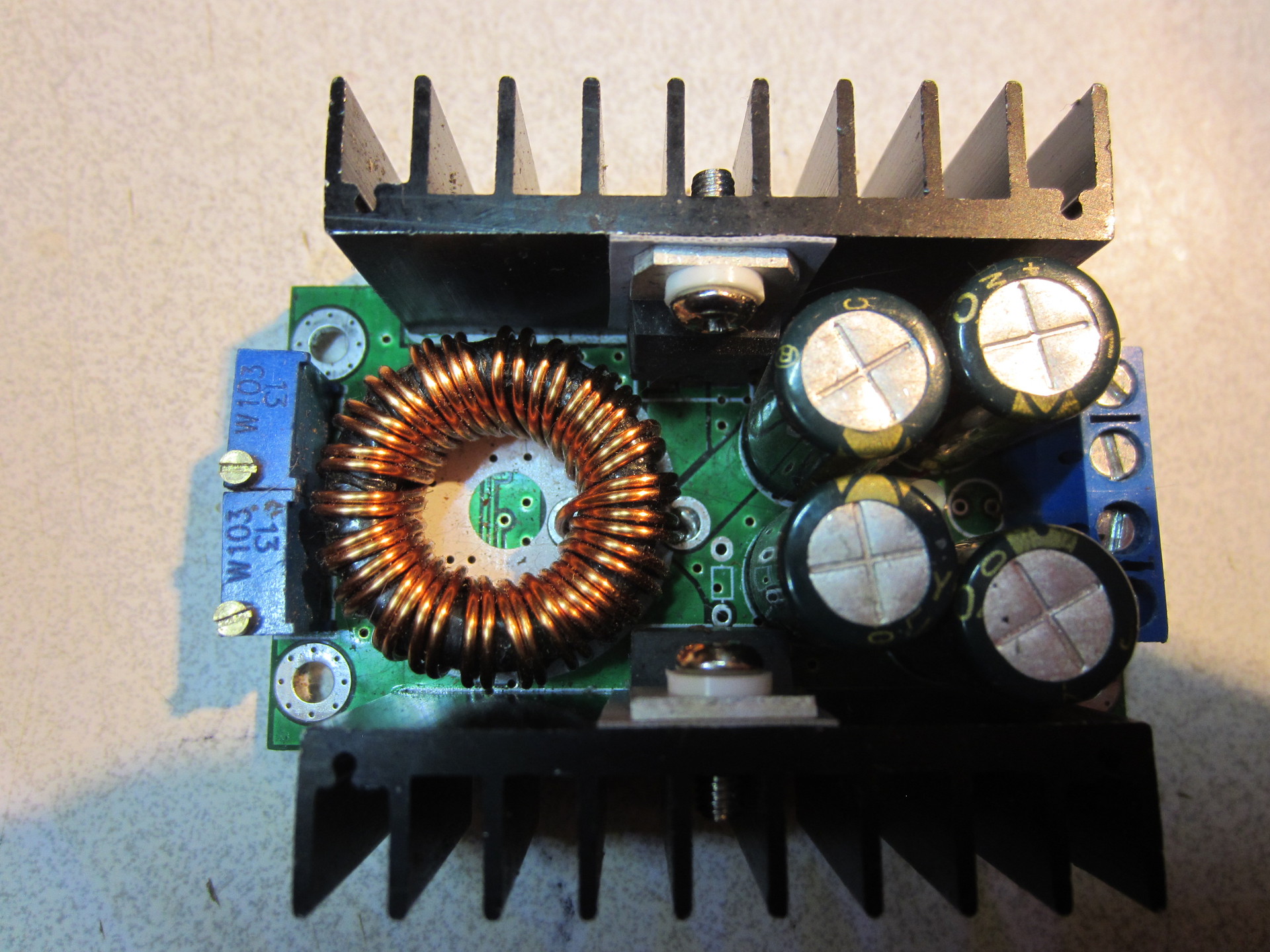 DC-DC konverter, amelynek a kimenetén megjelenik a szabályozható fesz, a kontroll LED nem világít, nincs teljesítmény leadása. a korábban használt LED világításom kb. 1/5 -öt fényerővel üzemel. melyik alkatrész lehet a hibás a kettő közül, a fotókon?