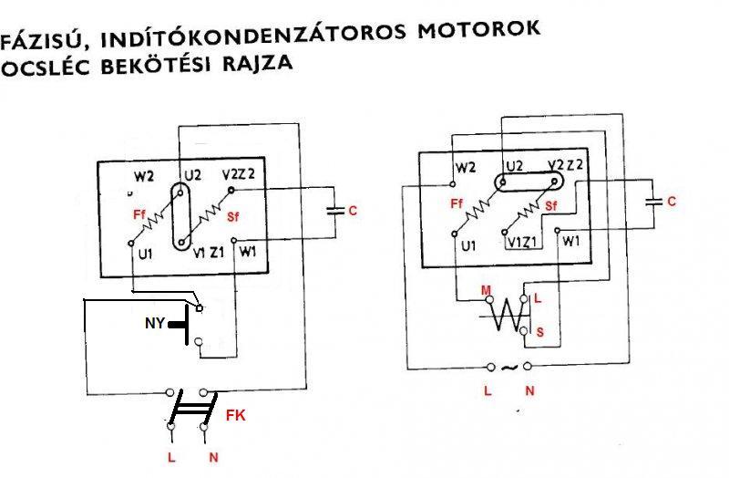 Szia! ITT van a gyári bekötése. A motorod kapocslécén kérdéses, hogy a zöld színnel kihozott tekercsvég az a főfázis tekercshez tartozik-e. Ha azok a kivezetések nem lettek átkötözgetve, akkor pedig annak kell lennie és a fekete a segédfázis. Mindettől eltekintve sehogyan sincs jól bekötve a motor a jelenlegi felállás szerint. Ha tudnál egy ellenállás értéket mérni a két tekercsen ami eldöntené a fő és segéd kérdését az mindenképpen sokat segítene. A főfázis tekercse kisebb értékű mint a segédfázisé és a jelenlegi bekötés szerint a segéd van főfázisként táplálva.