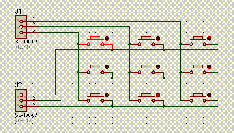En a billentyut valahogy igy kotnem be, igy persze kicsit trukkosebben kell lekezelni, azonban van nehany elonye: 1. sporoltunk kapasbol 3 labat 2. csak 3 labra kell felhuzo, azokat pedig at lehetne tenni az PORTB-re ahol van belso, igy 9 felhuzo kiesik (a kijelolo labak lehetnek masik porton, azoknak nem kell felhuzo ellenallas) 3. Ha ugyes vagy, akkor elegendo 6 polusu csati a nyakodon, es a keypad modulodon intezed el, hogy igy legyen matrix Ahogy mukodik: A J1 a kijelolo ag, a J2 pedig a letapogato. J1 egyesevel kijeloli a vonalakat, meghozza ugy, hogy tristate-ben kapcsolgatja lebegtetesre a kijeloletlen, es aktiv 0-ra a kijelolt oszlophoz tartozo labat. Ezutan a J2 letapogat, soronkent nezi vegig mi aktiv. Ha 1. oszlop aktiv es a 2. soron erzekel lenyomast, akkor meg is van mit nyomtak. BUG: Tobb gomb egyideju nyomasa.. Nos, ez igy onmagaban egyszerre csak 1 gomb megnyomasara van felkeszitve. Ahhoz, hogy a vegleges eredmenyt megkapjuk vegig kell tapogatni a matrixot, ha egyszerre tobb nyomas is erzekelodik akkor ervenytelen a beolvasas... Ugyanis ha pl egyszerre 3 gombot lenyomnak "L" alakban akkor hibas beolvasast eredmenyezne - ahogy arra Szilva felhivta a figyelmem. Ha kell tobb gombnyomas, akkor diodakat kell alkalmazni. Meg egy kiegeszites: Letezik 1 pines megoldas is, akkor egy ellenallas halozattal lehet analog porton keresztul kivalasztani az eredmenyt - igy megtobb lab szabadul fel, es elegendo ket tuskes csati a keyboard modul fele.