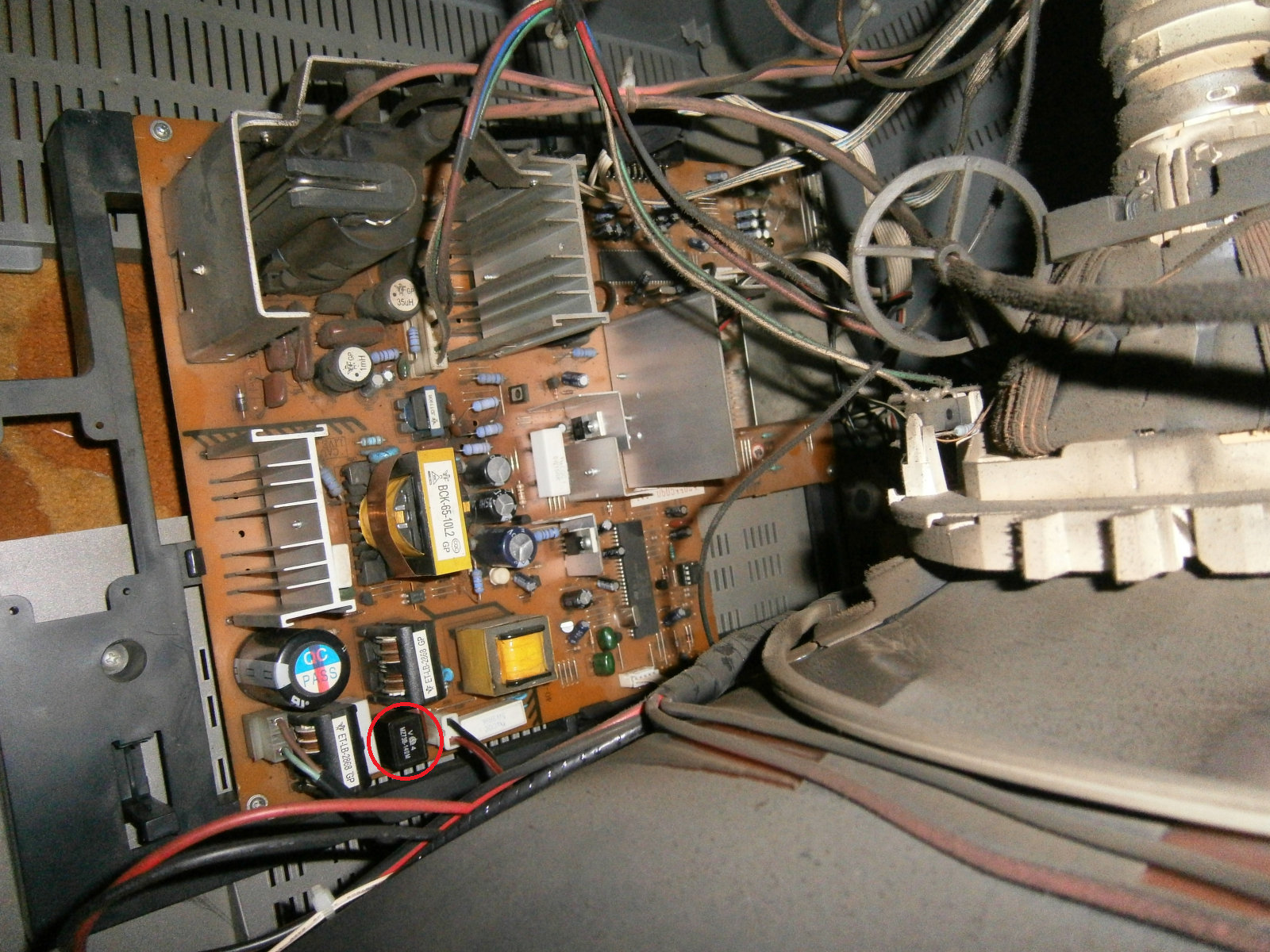 Ezt az alkatrészt keresd meg, a tápegység közelében van.. és cseréld ki egy ugyanolyanra. Mármint ugyanolyan alakúra.. 3 lábú, esetleg 4 lábú, nem tudom milyen van benne. ha nincs akkor a kivett példánnyal irány egy elektronikai szakáruház. Nem egy hatalmas összeg. A sorkimenő dolgozik, szolgáltatja a nagyfeszültséget, annak semmi baja nincsen. ( A "bohóckarikán" nagyon nevetek.. )