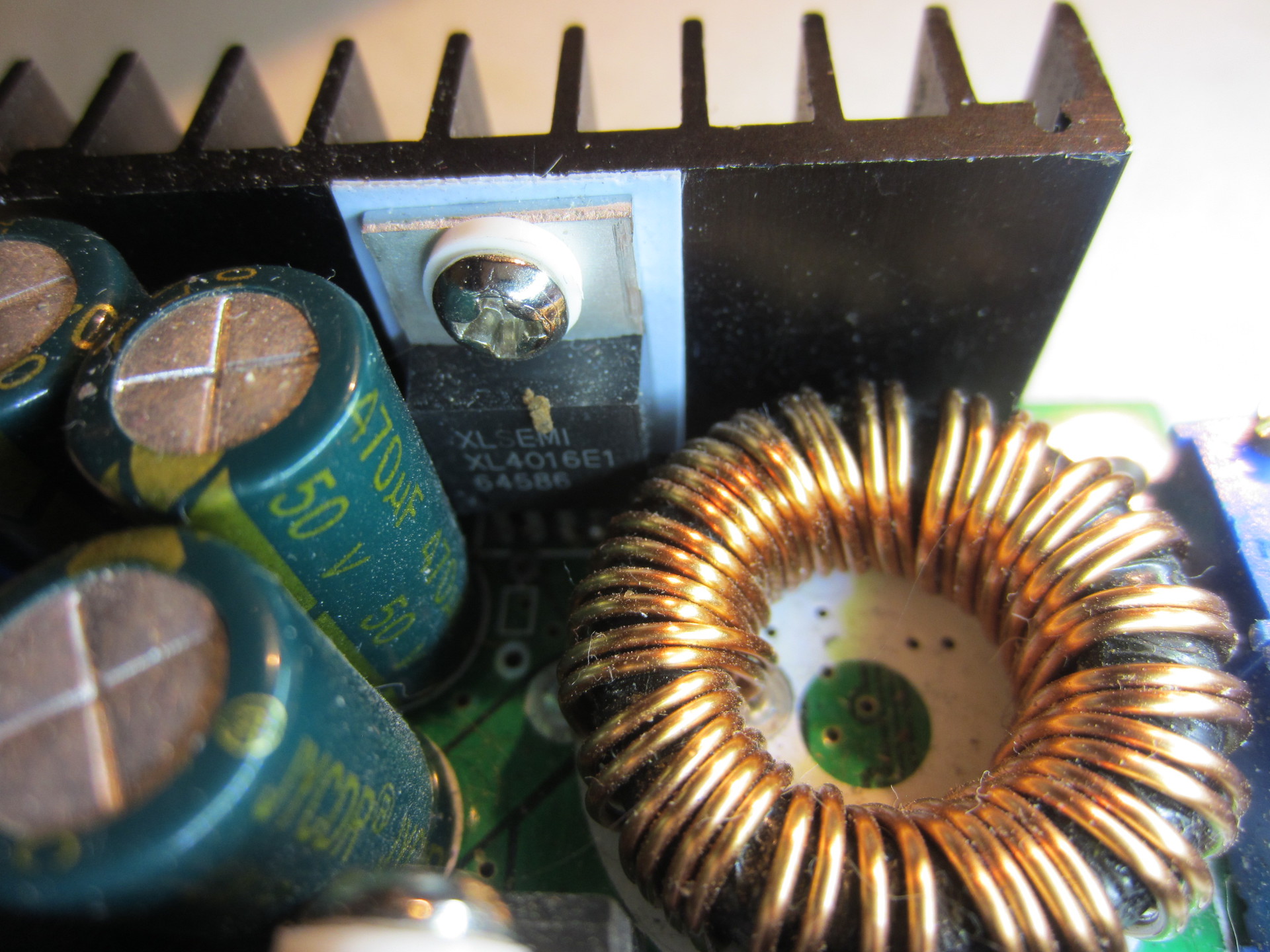 DC-DC konverter, amelynek a kimenetén megjelenik a szabályozható fesz, a kontroll LED nem világít, nincs teljesítmény leadása. a korábban használt LED világításom kb. 1/5 -öt fényerővel üzemel. melyik alkatrész lehet a hibás a kettő közül, a fotókon?