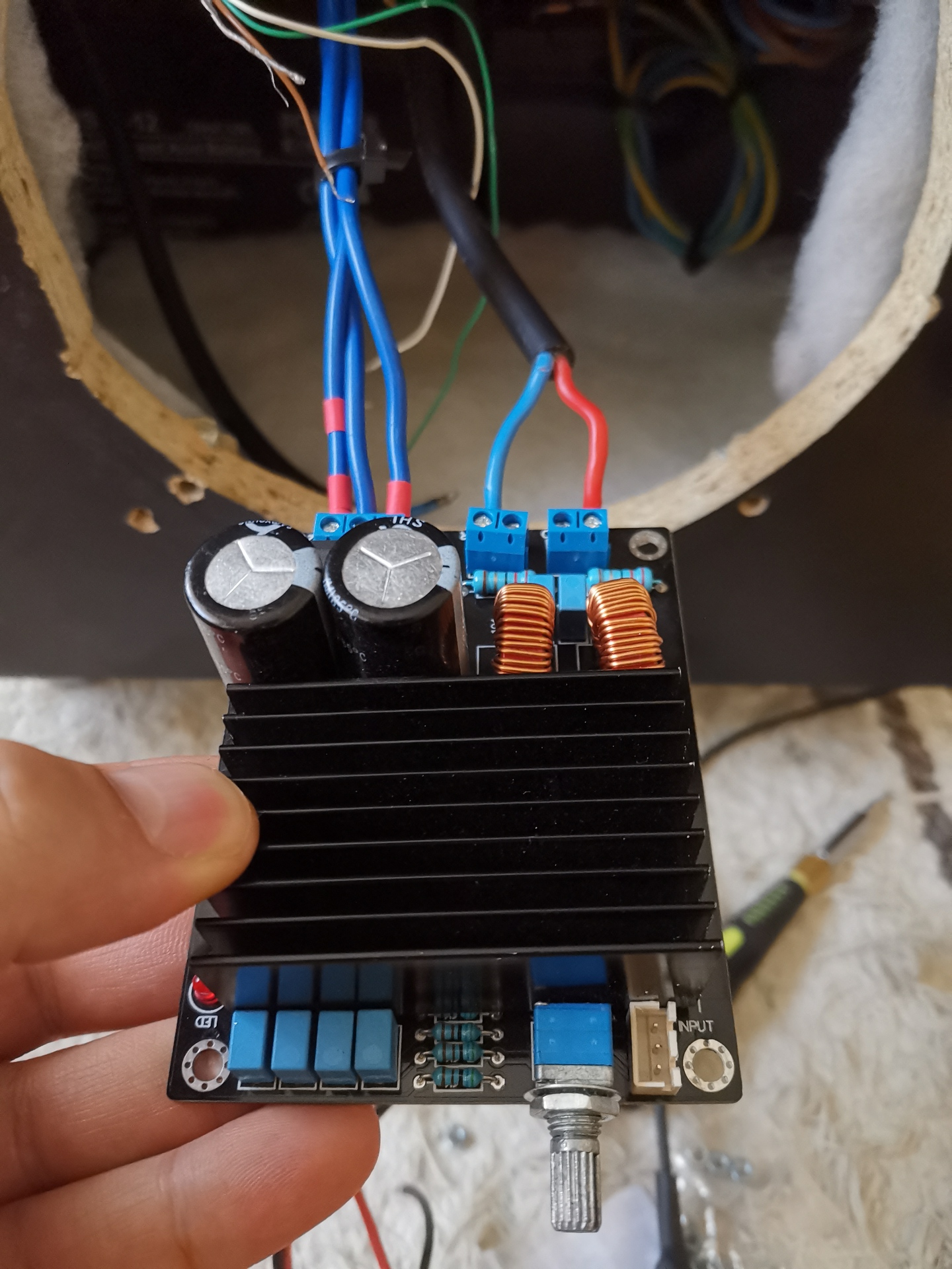 Adott egy kerekes saját építésű hordozható hangdoboz. 2x12V 12Ah akkumulátorok, ez 2 Step-Uppal 2x25V-ra beállítva. Passzív hangváltó, Reflex magas és közép. Eddig egy TDA 8920 volt benne de egy szétszedésnél fordítva kötöttem a tápágakat, szóval rendeltem egy TDA8950-et. Hidalva próbáltam kötni, elvileg ehhez a 2 vonal végpontjait rövidre kell zárni, és a BTL jelű körbe kell forrasztani a bemenő jelet. (Nem teljesen biztos, mert leírás nincs a panelhoz, de netes fórumok alapján ezt szűrtem le.) A probléma: nagyfrekvenciás gerjedést (?) hallok belőle, amint ide akár egy kábelt is forrasztok. Mindegy, hogy melyik forrpontra, ugyanaz a hang. Ha üresen hagyom, vagy egybeforrasztom a pontokat, akkor semmi gond. Ha az eredeti, sztereó input csatlakozókra forrasztok, akkor is ugyanez az eredmény. Előerősítő menne elé, ez látható a képeken, így is azt csinálja, és akkor is, ha csak egy sima mono jacket kötök a két pontra. Ha a jackre telefont kötök, akkor sem változik. (tehát impedanciától nem függ). A mélyközép ki van kötve a rendszerből, ha bekötöm, kicsit halkul, de csak éppen észrevehetően. Ha a hangerő elé kötöm a kébelt, és letekerem, akkor csökken a zaj, de teljesen leterekt állásnál is hangosabb, mintha leforrasztom a panelről a vezetéket, és a levegőben lógnak. A Step up-ok eddig is benne voltak (ugyanebben az elrendezésben), és nem volt ez a zaj, pedig akkor a kábelek is a dobozban futottak, nem így, előtte, mint most. Tudom, árnyékolt kábelek, az is lesz majd, de azokkal is megvolt a hiba. Hol kezdjem a javítást?