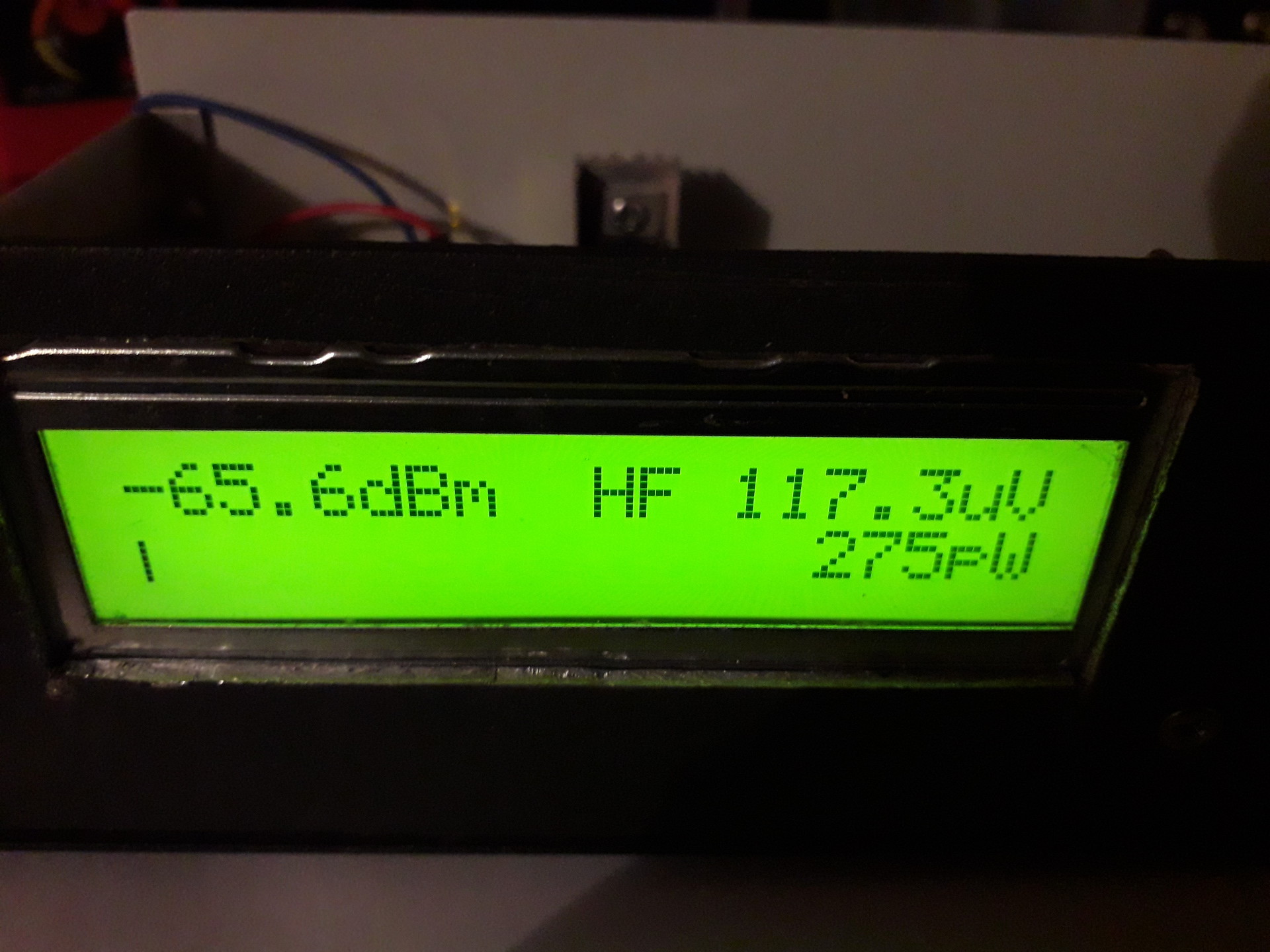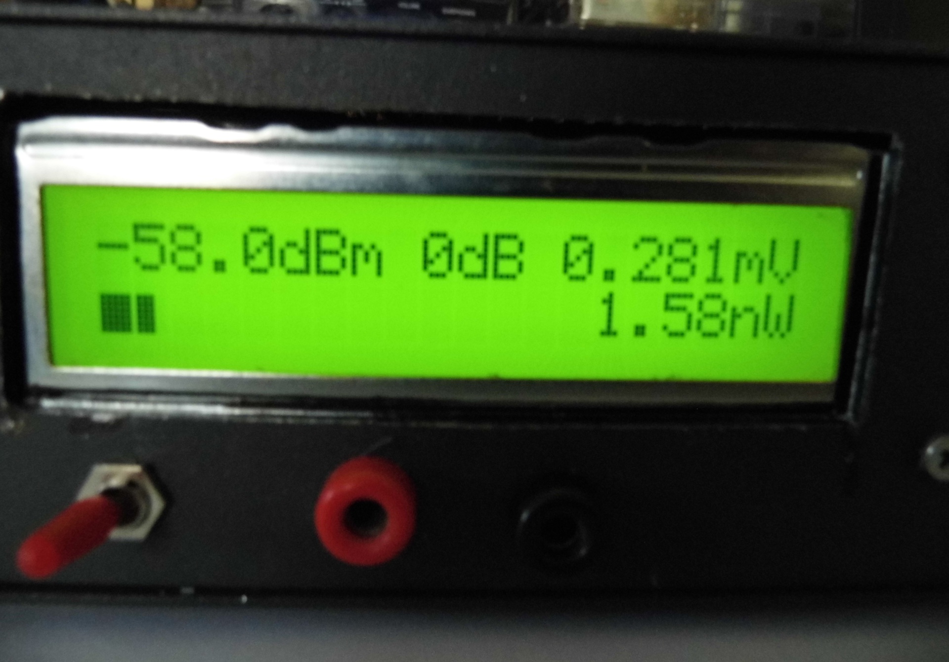 A készülék működik. Az előtét egységet egy hagyományos árnyékolt kábellel kapcsoltam a +5V -os tápfeszültséghez. Az egység kimenő jelét pedig egy kis koax kábellel vezettem vissza a főegységhez. Tudom most BNC csatlakozó van! Azonban a héten megérkezik az SMA csatlakozó is és a korábban említett koax kábel is.