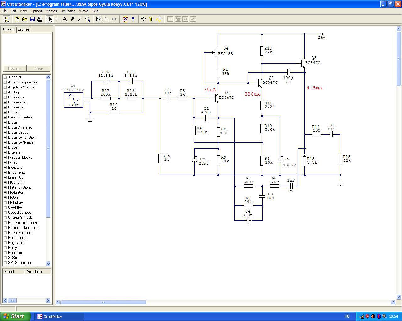 R1 értéke a jFET típusától függően változik. Élesztéskor 47 kOhm-os trimmer potit köss be R1 helyére, de vigyázz ne csavard a minimumra. Ha nem bízol magadban inkább köss vele sorosan 22 k körüli ellenállást. A maximális kivezérelhetőséget 14,8 V-os kimeneti feszültségnél kapod, mint a szimuláción látszik. Ha minden alkatrészt helyesen ültettél be, elég ezt az egyetlen feszültséget mérned. Értelemszerűen ennél a munkapont beállításnál lesz a legkisebb torzítása is. A korrektor erősítése 66.8-szeres, ebből a maximális bemeneti feszültség 1 kHz-en 80 mVeff. 22 Hz-en van 2.4 dB és 20 kHz-en 1 dB kiemelése. Mindenképpen kis zajú stabilizált tápegységgel használd. A nyákrajzod még nem néztem, de mindjárt átnézem.