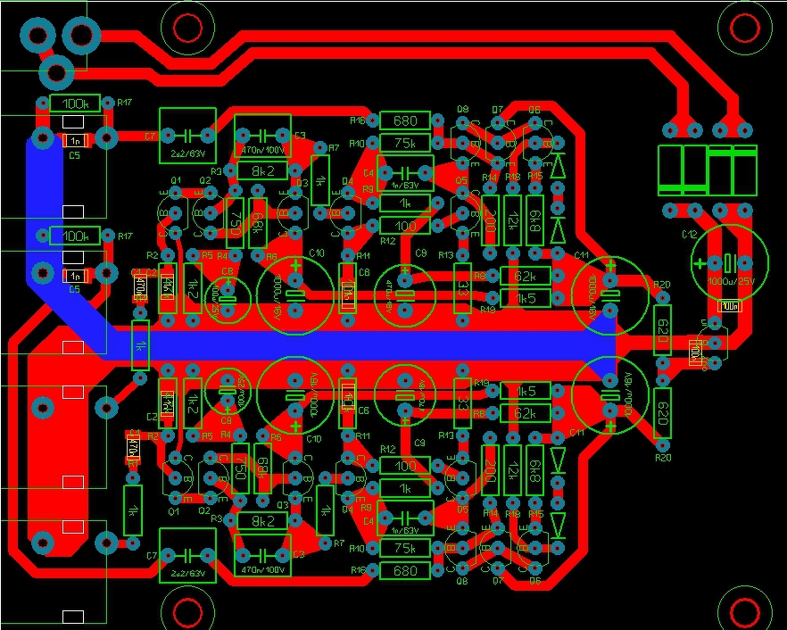Így szoktam nyákot tervezni. Nem biztos, hogy ennél nem lehetne még jobbat, szebbet, de tőlem ennyi telik, erre is ráment két és fél napom mire így "kisakkoztam". Örülnék ha valaki(k) kipróbálná(k) ezt a kapcsolást és összetesztelnék valamivel, mert gőzöm sincs róla mennyire szól jól, vagy rosszul. Ha lenne LP játszóm akkor sem tudnám meghallgatni, mert nekem mindig mc hangszedőm volt (pontosabban az utolsó 30 évben). Három ember hallgatta meg eddig, ketten azt mondták szépen szól, a harmadik nem hallott különbséget a saját RIAA-ja és e között, de szerintem itt vagy az illető fülével volt gond, vagy a rendszer felbontásával.