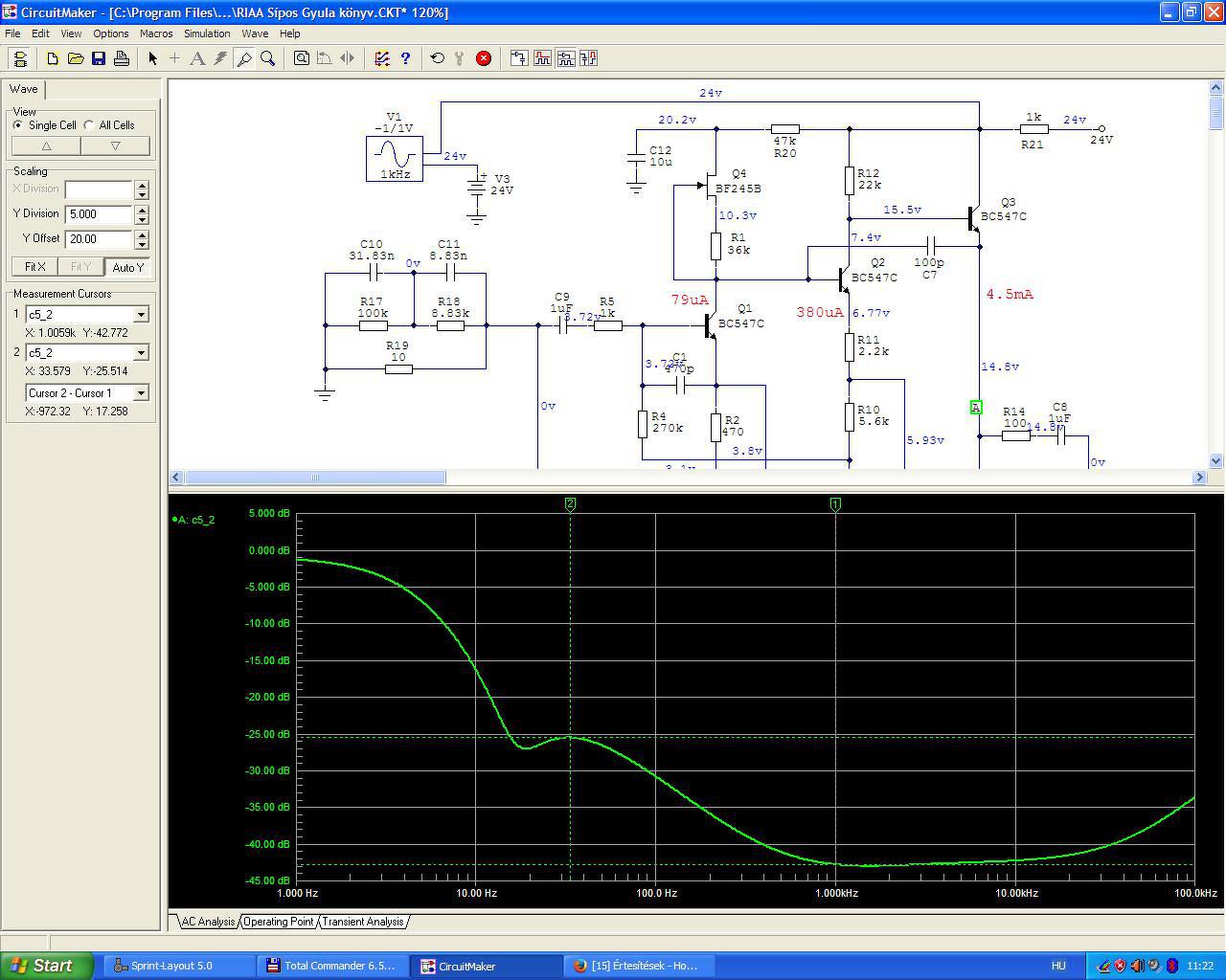 Néhány szót a kapcsolásról. Az első fokozat emeli ki a mély hangokat, 50 Hz-en erősít tízszeresen, 500 Hz fölött feszültségkövető. A második fokozat is aktív visszacsatolású, 73.5-szeresen erősít 2122 Hz-ig, 156 kHz fölött feszültségkövető. 156 kHz felett R16, C7 vágja a magasakat.