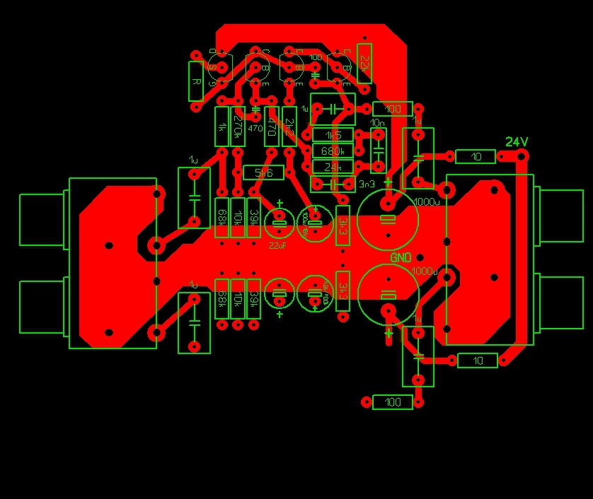 A GND fóliát így alakítsd ki szerintem. Nem tudom készre rajzolni a nyákot, mert nem ismerem sem a kondik méreteit, sem az RCA csatlakozó lábkiosztását.