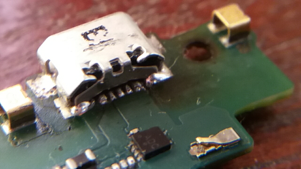 Korábban tényleg úgy látszott, hogy sérülés miatt keletkezett a fenti híd az 5. láb és a lyuk között, de ahogy kapirgáltam, kezdtem megingani. Már úgy voltam, hogy van egy régi rossz aTAB telefonom, szétszedem megnézem ott mi a helyzet, még jó hogy itt rákérdeztem, bár látom nincs egyetértés, de akkor is hasznos volt. További kapirgálás helyett inkább visszaforrasztom az usb csatit, úgy hogy a 5.láb és lyukat összefolyatom ónnal.