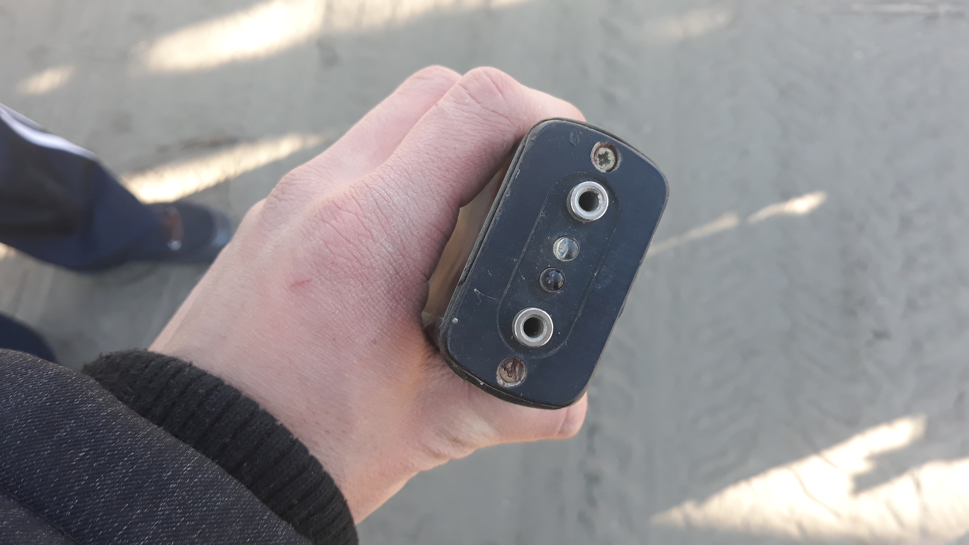 Szinte biztos, hogy ez egy őrjáratellenőrző készülék. A biztonsági őr végigmegy a telephelyen, adott helyeken hozzáérinti egy RFID tag-hez, ami memóriában rögzíti az időpontot és a TAG azonosítóját. Az út végén rádugja egy tartóra ( 2 banánhüvelyen keresztül töltődik az akku, és az infrán keresztül letöltődik az adat.