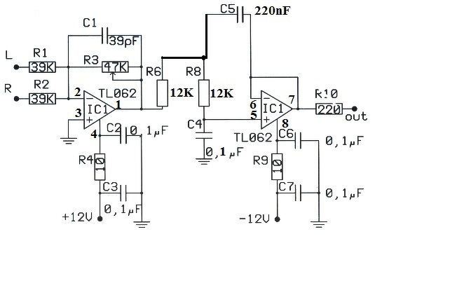 Kaptam egy 2.1-es szettet, amihez nem volt távirányító, így eredeti voltában nem tudtam semmire se használni. Kidobtam belőle mindent, csak a táp és a végfokok maradtak, gondoltam a többit majd én hozzáépítem. Megépítettem az egyes ábrán látható (Topi féle) szub szűrőt, ami működött is. Azonban, sajnos csak később mértem meg a tápfeszt és ekkor derült ki a 2x12V volt nem annyi, mint ami oda volt írva, hanem 2x19V. Ezt már soknak tartottam az NE5532 számára, ezért úgy döntöttem átalakítom a kapcsolást aszimmetrikus táp ellátásúra a 2. ábra szerint. Van a készülékben független (használatlan) tekercsről 1x 15V, ezt fogja megkapni. Az átalakított kapcsolás (külső 12V táplálás esetén is) be, és kikapcsoláskor kilengeti a mélynyomót, pukkan egyet, de hangot nem ad ki. Ahogy elkezdem felfele tekerni a P1-et, halkan szól valami a szubból, a poti fél állásától tovább tekerve megint elhallgat. A poti letekert állásában az IC 1, 7- lábain fél tápfeszt mérek, tekerve felfelé nő a fesz a lábakon, fél állástól pedig gyakorlatilag a teljes tápfesz megjelenik. A szub végfoka egy tda2030-al épült szimmetrikus tápellátású adatlapi kapcsolás. Nem tudom, mit ronthatok el, de a hiba okát nem találom. (Ettől azért komolyabb dolgokat is javítottam és építettem is már.) Visszaalakítottam szimmetrikus táplálásúra, és ismét működik, tehát az IC még nem ment tönkre. Kérem, akinek ötlete van... Köszönöm!