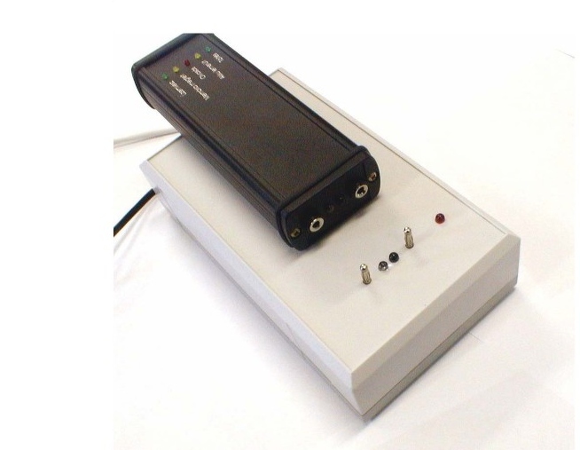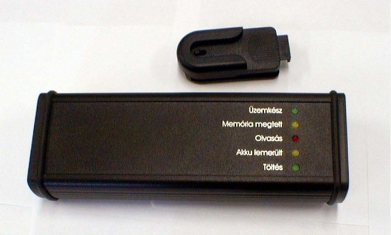Szinte biztos, hogy ez egy őrjáratellenőrző készülék. A biztonsági őr végigmegy a telephelyen, adott helyeken hozzáérinti egy RFID tag-hez, ami memóriában rögzíti az időpontot és a TAG azonosítóját. Az út végén rádugja egy tartóra ( 2 banánhüvelyen keresztül töltődik az akku, és az infrán keresztül letöltődik az adat.