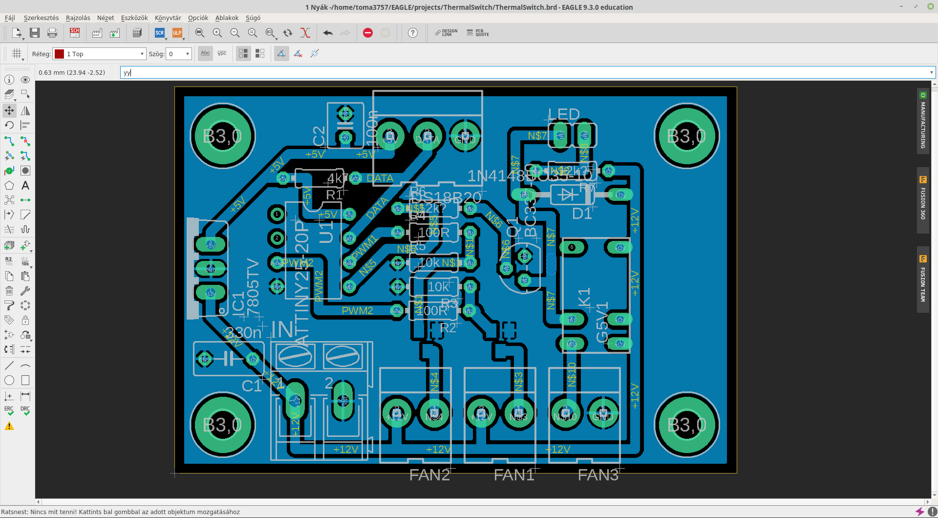 A NYÁK jónak tűnik, ettől függetlenül lehet, hogy van rajta valahol zárlat. Viszont. A kontroller +5 V-os lábánál nem látok 100 nF-os kondenzátort. A 7805-ös IC kimenetésől is hiányzik a 100 nF.