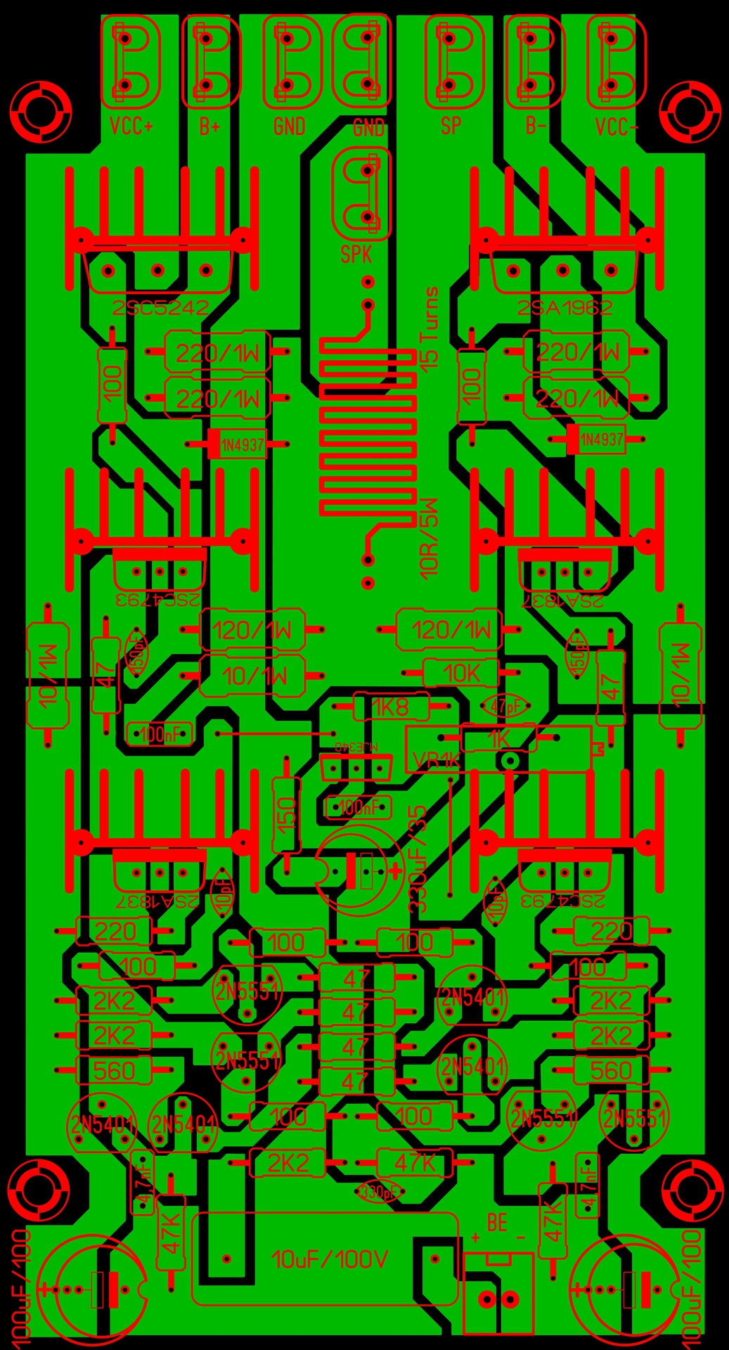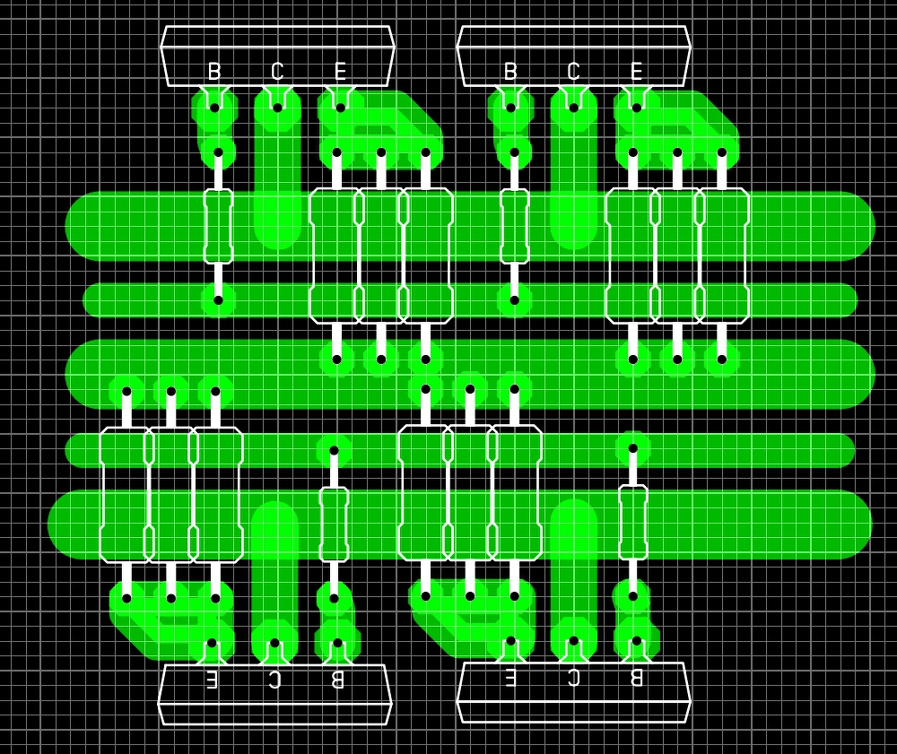 A teljesítmény panelon túl sok a cikk-cakk, és a tranzisztorok mögött is van vezeték. Egyikre sincs szükség, javaslom ezeken módosítani.