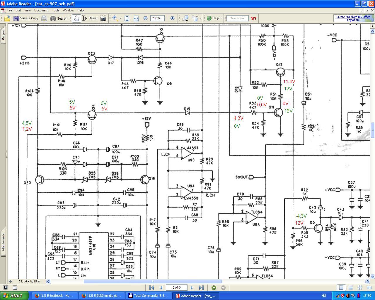 Segítségetek kérném, elakadtam erősítő javításban. Csatoltam a kapcsolási rajzot és amit nem értek arról egy rajzot. A kiemelt rajz a 3dik oldalon van q23 és q24 tranzisztor esete. D15 és D17 diódát kiemelve a készülék működik. (center SL SR némítása, ez esetben készült a kézi rajz mérése is). Természetesen a tranzisztorokat kiemelve teszteltem működűképesek. Mit nézhettem el, mi lehet a gond?
