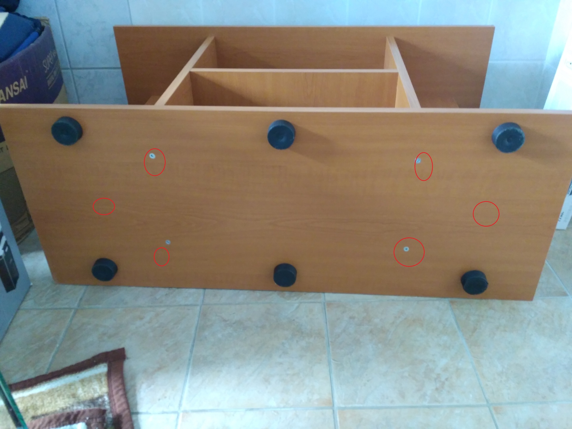 Igen, így gondoltam. Maradjon a meglévő 6 láb, de tegyél legalább az a négy pirossal jelölt alá is, amelyikeknél a csavarfej is van. Most nézve felbillenés miatt kevés lenne csak a pirossal jelölt helyre, tehát jó ha van amit már felraktál, de kiegészíteni ajánlatos a négy jelölt lábbal is. Vagy a hat pirossal jelölttel is, ha van kedved a sok lábhoz.