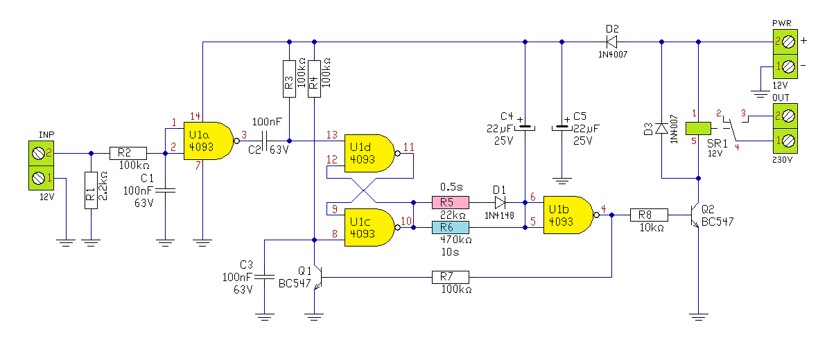 Hello! Ebben a kapcsolásban alapvetően nincs külön tároló a működésre. Vagy is a gomb megnyomásakor tápfeszt kap az áramkör, a tápot aztán a relé biztosítja, mint "öntartó kör". Amikor pedig lejár az idő, a tranyó elejti a relét és ezzel a tápfesz is megszűnik.