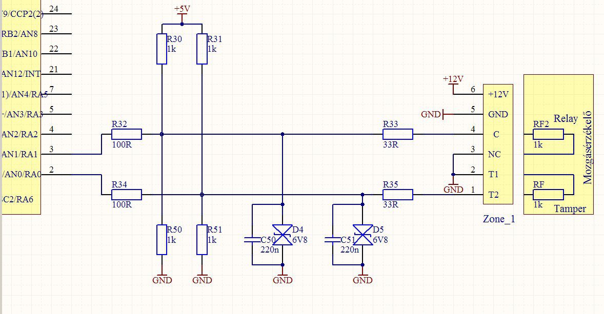 A mozgásérzékelő +12V-ja és a relé kimenet közé tennék egy ellenállást, amit a mozgásérzékelő reléje érzékeléskor földre húz. A kontroller oldalán pedig egy optocsatolóval fogadnám a jelet. Így alaphelyzetben az opto folyamatosan adja a PIC bemenetére a jelet. Érzékelés, vagy szabotázs esetén megszűnik a jel, lehet riasztani.