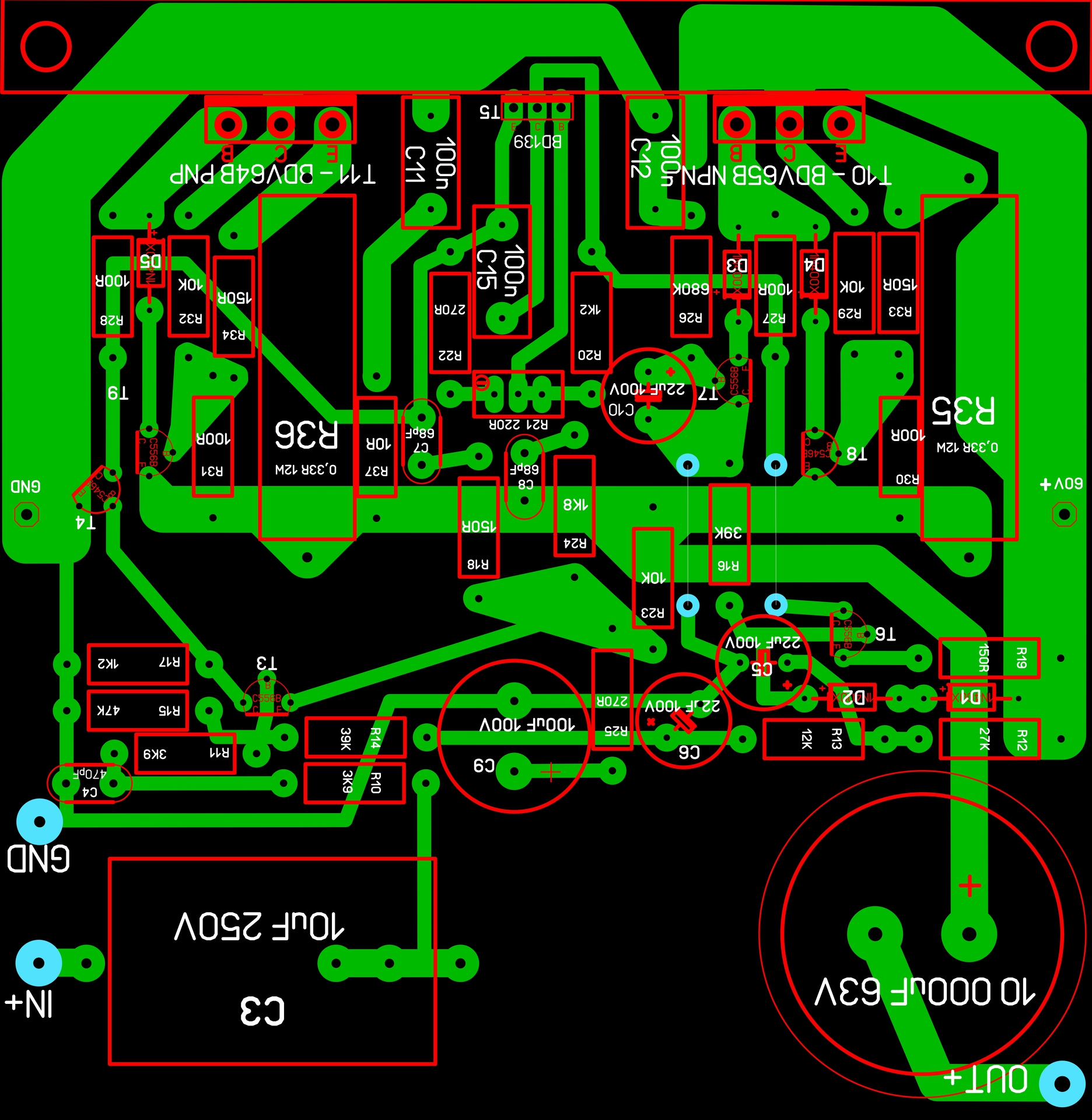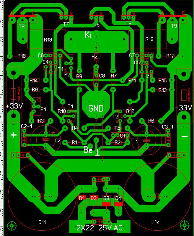 A végtranzisztorok áramát (ide értve a nyugalmit is) I1 és I2-vel jelöltem. Ezek az áramok feszültséget ejtenek a vezetősávon. A sárga nyíl által mutatott testpontokra a további vezetősávok által leosztva kerül ebből feszültségből. Ez búgást, gerjedést. torzítást okozhat - teljesen feleslegesen. Ha a test bekötési pontból külön vezetősávon indul a nagyáramú- és a jelföld, akkor zavarmentesen működne az erősítő. Tettem a rajzra két piros nyilat is. A szerény információ alapján is felmerül bennem a gyanú, hogy ott a bemenő és a kimenő jel keresztezi egymást, ami súlyos tervezési hibának számít. Még egy gyanús elemre lettem figyelmes, olyan mintha a bemenet tájékán nagytestű axiál kondik lennének. Az is más dimenzióba helyezi az egészet, mellyel külön topic foglalkozik.