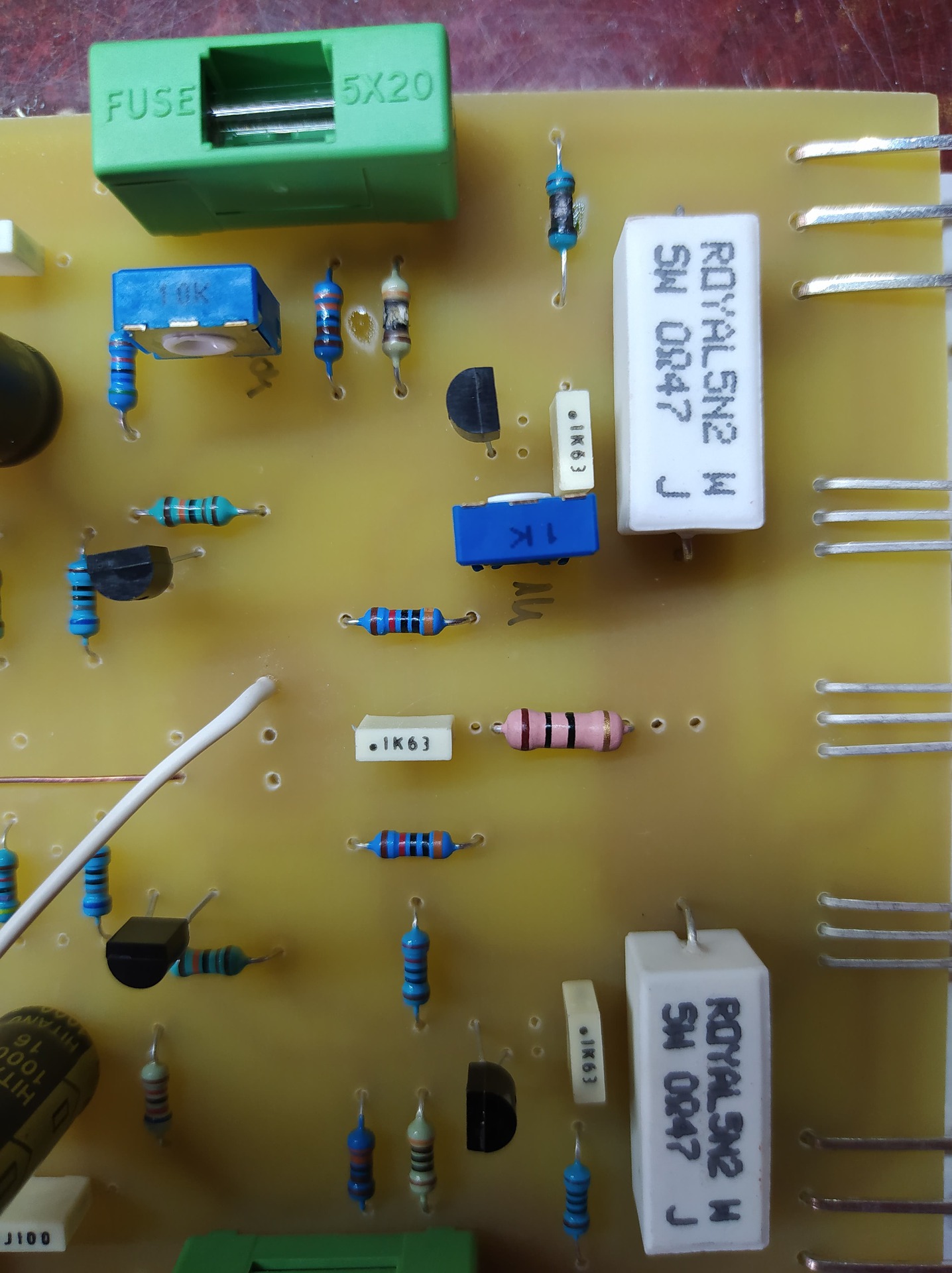 Szia! Ha jó a T8-as végtranzisztor, a akkor bázis és emitter között egy diódát kéne észlelned multiméter segítségével. Ennek hiányában a nyugalmi és a kimenő áram az R16-on keresztül talált magának utat. Az R16 elégése után következett az R14.