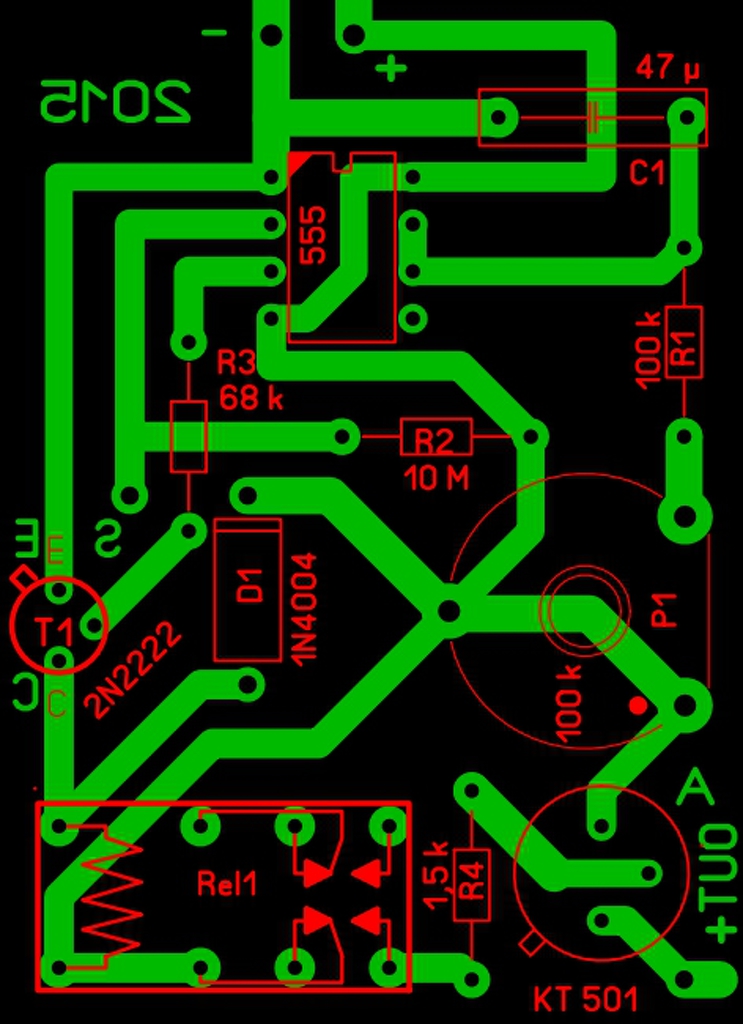 Hello! Ha tirisztort használsz, akkor bekapcsolás után az nem kapcsol ki. De a relé - tranyó szükségtelen. Ha az R4 végét (nyákrajzon) egy diódán keresztól bekötöd az 555 3-as lábára, ugyan erre az eredményre jutsz.