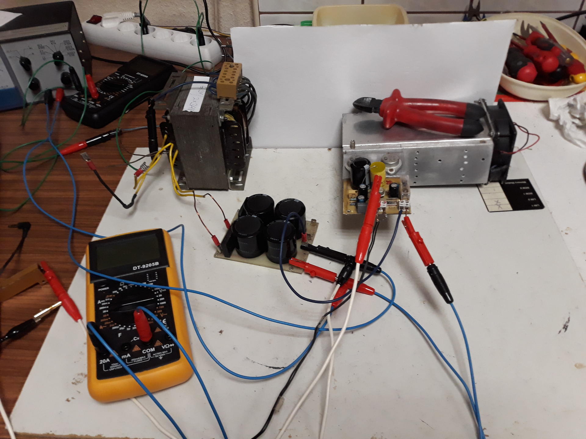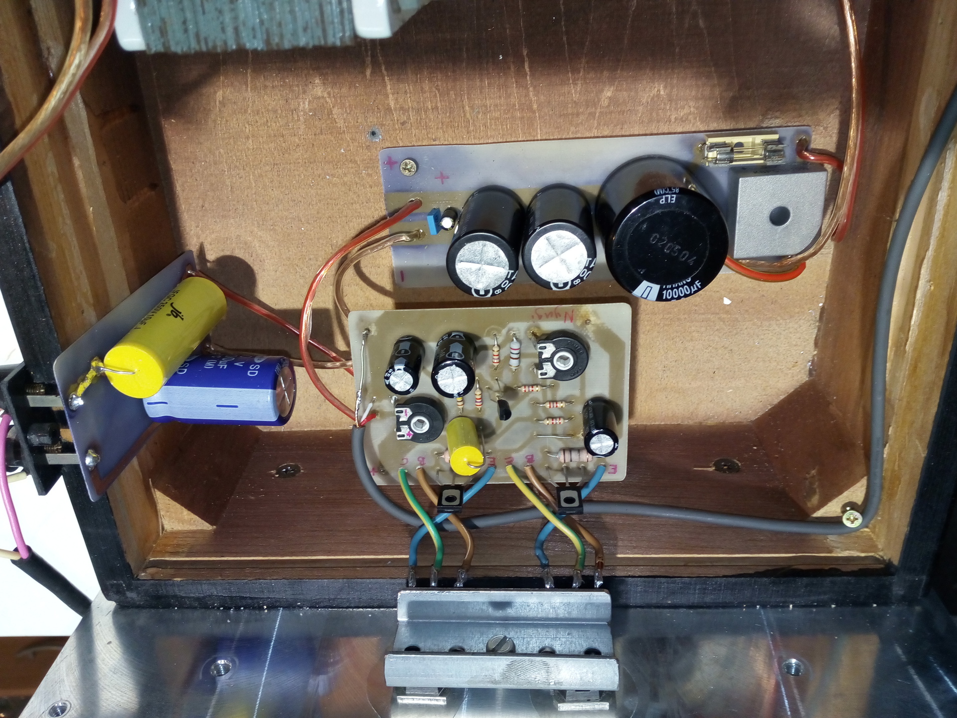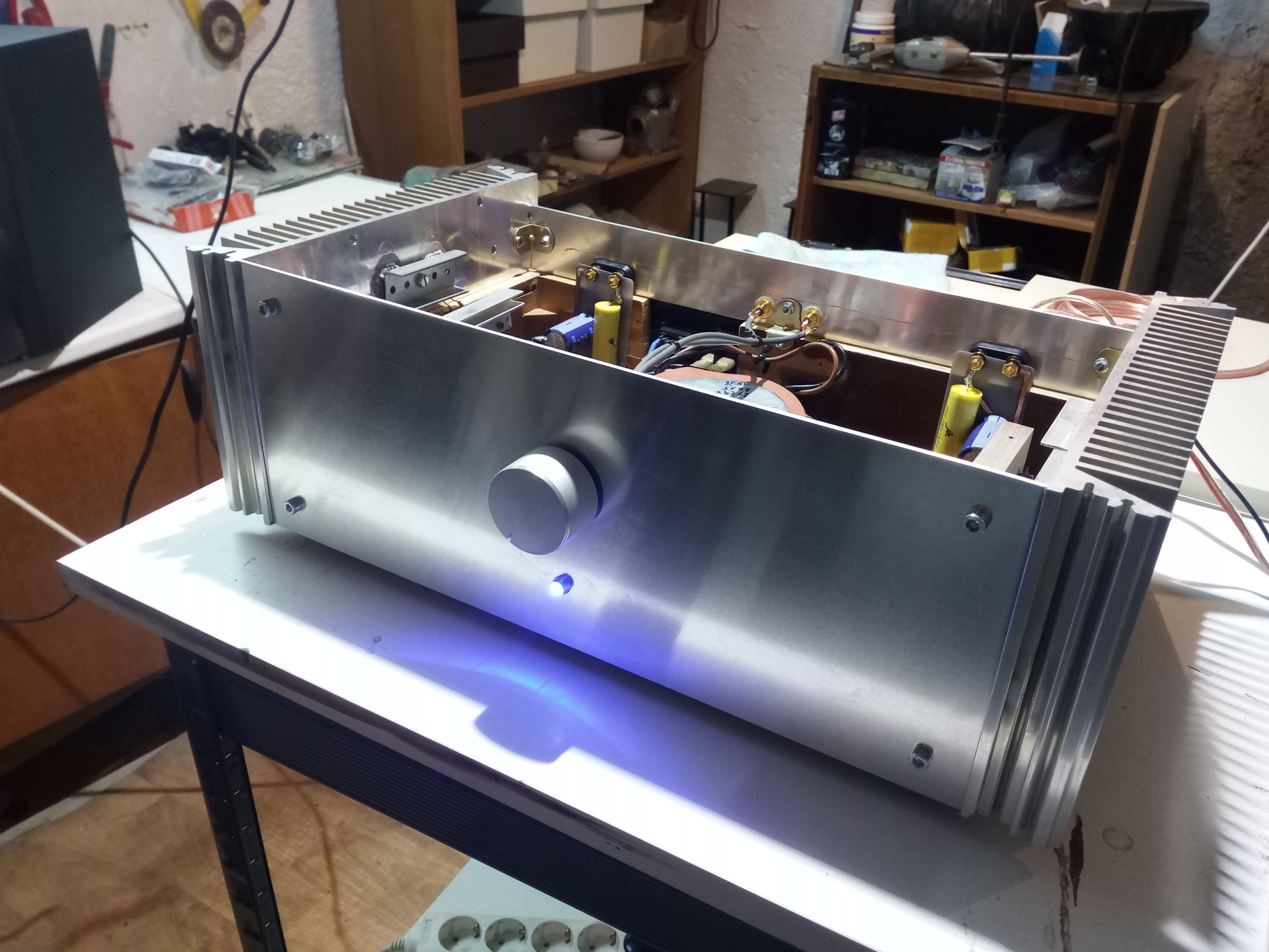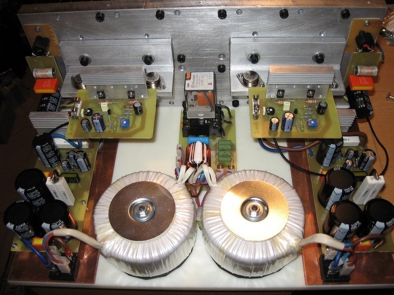 Itt tartok. Szólt egy órát, állítgattam a nyug áramot, fél tápfeszt. 24 voltról megy 1,7A körül. Fűt így is rendesen, de azért majd veszek bele trafót, meg vmi hűtést az egyenirányítókra. Van még sokminden tenni való, de az alap megvan. Egyetlen probléma, hogy búg. Nem veszélyes, de zavaró.